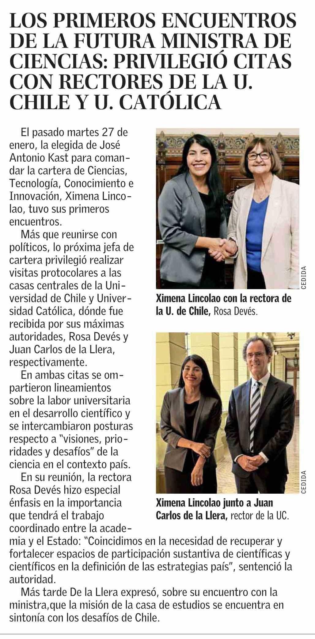 LOS PRIMEROS ENCUENTROS DE LA FUTURA MINISTRA DE CIENCIAS: PRIVILEGIÓ CITAS CON RECTORES DE LAU. CHILE Y U. CATÓLICA 01-02-2026 El Mercurio |
