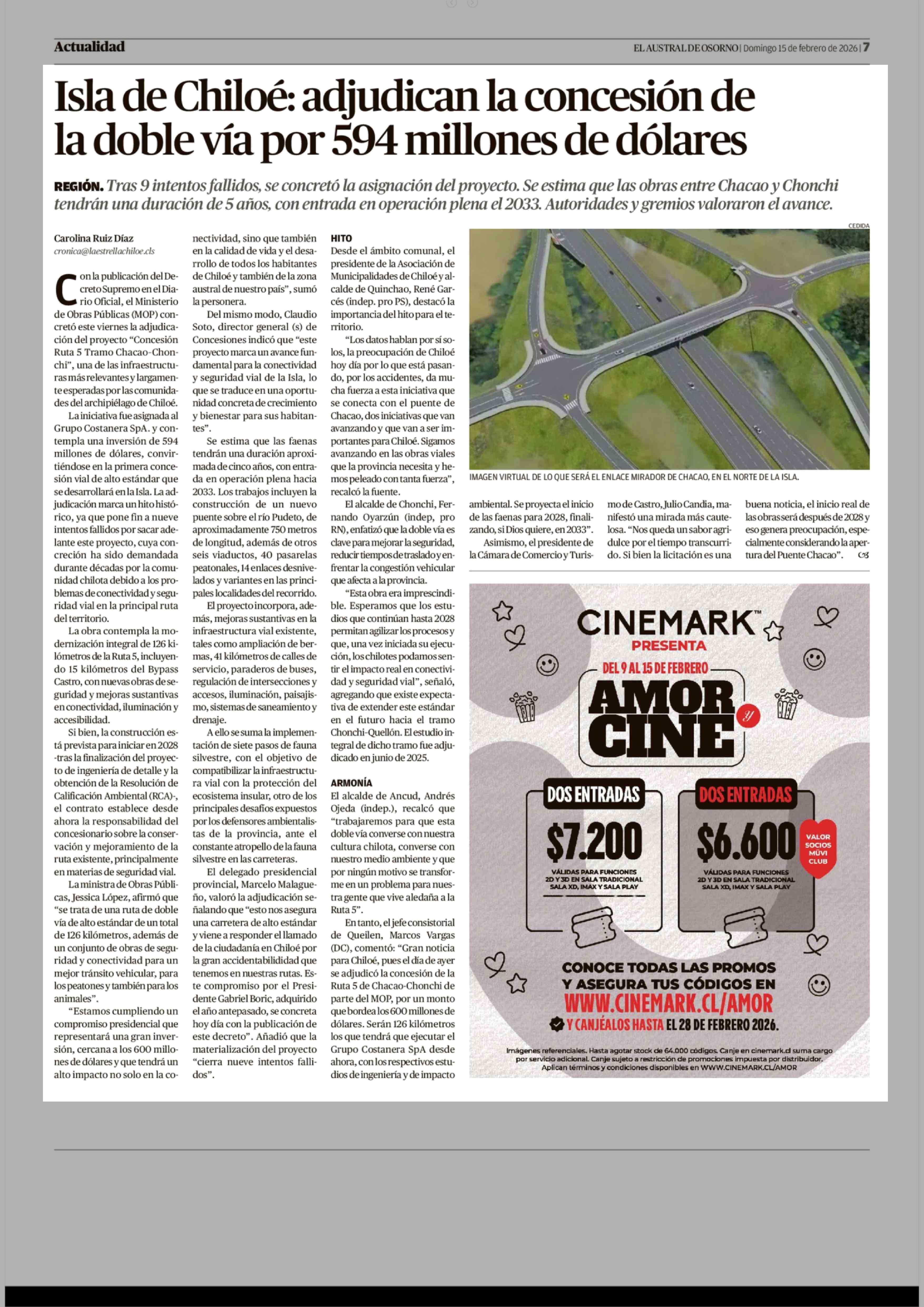 Título: Isla de Chiloé: adjudican la concesión de la doble vía por 594 millones de dólares