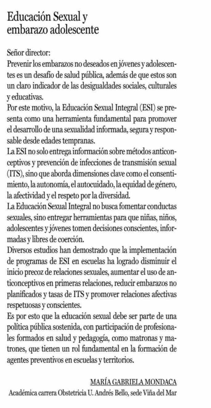 CARTAS: Educación Sexual y embarazo adolescente 12-06-2025 La Prensa de Curicó |