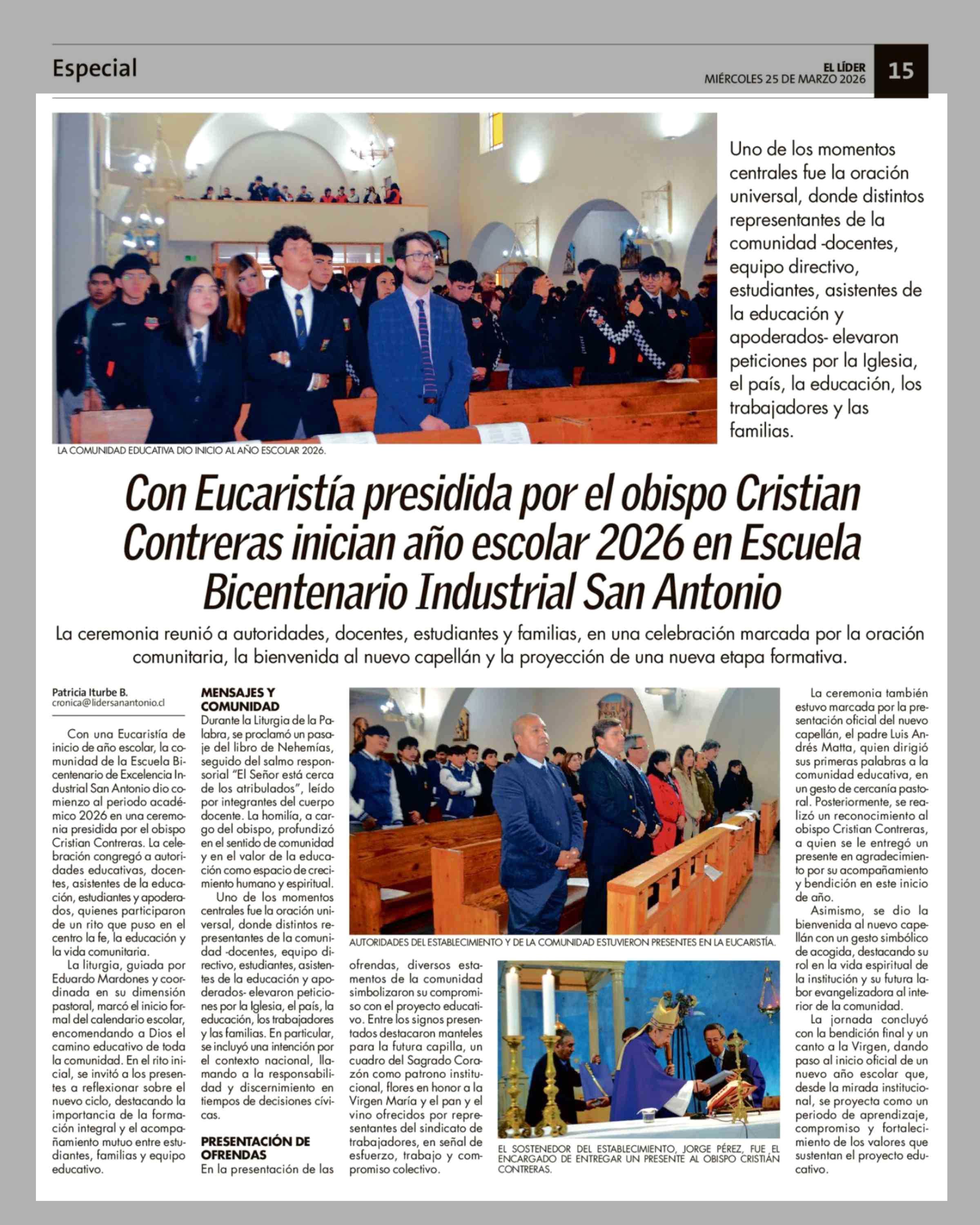 Título: Con Eucaristía presidida por el obispo Cristian Contreras inician año escolar 2026 en Escuela Bicentenario Industrial San Antonio