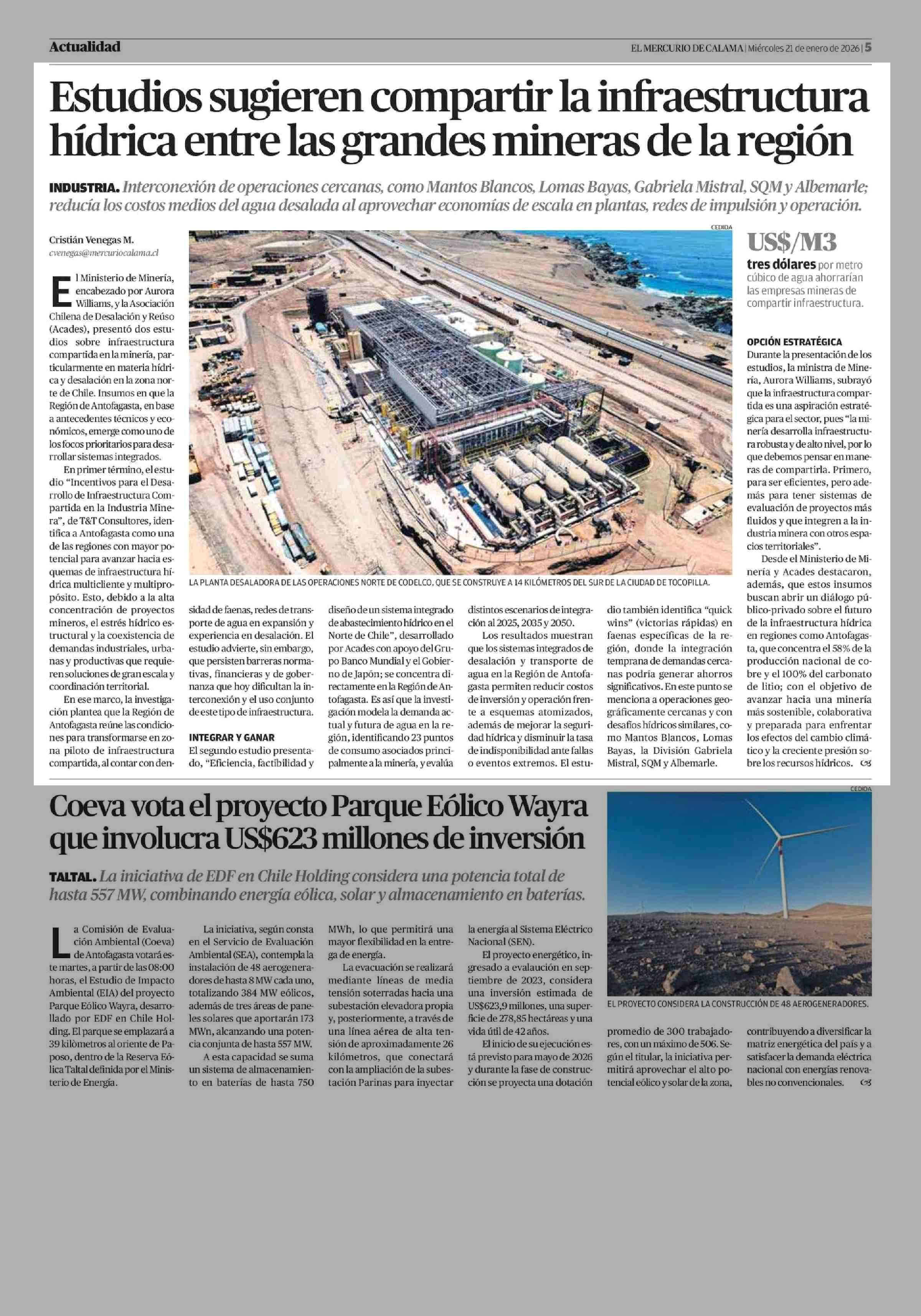 Estudios sugieren compartir la infraestructura hídrica entre las grandes mineras de la región 21-01-2026 El Mercurio de Calama |