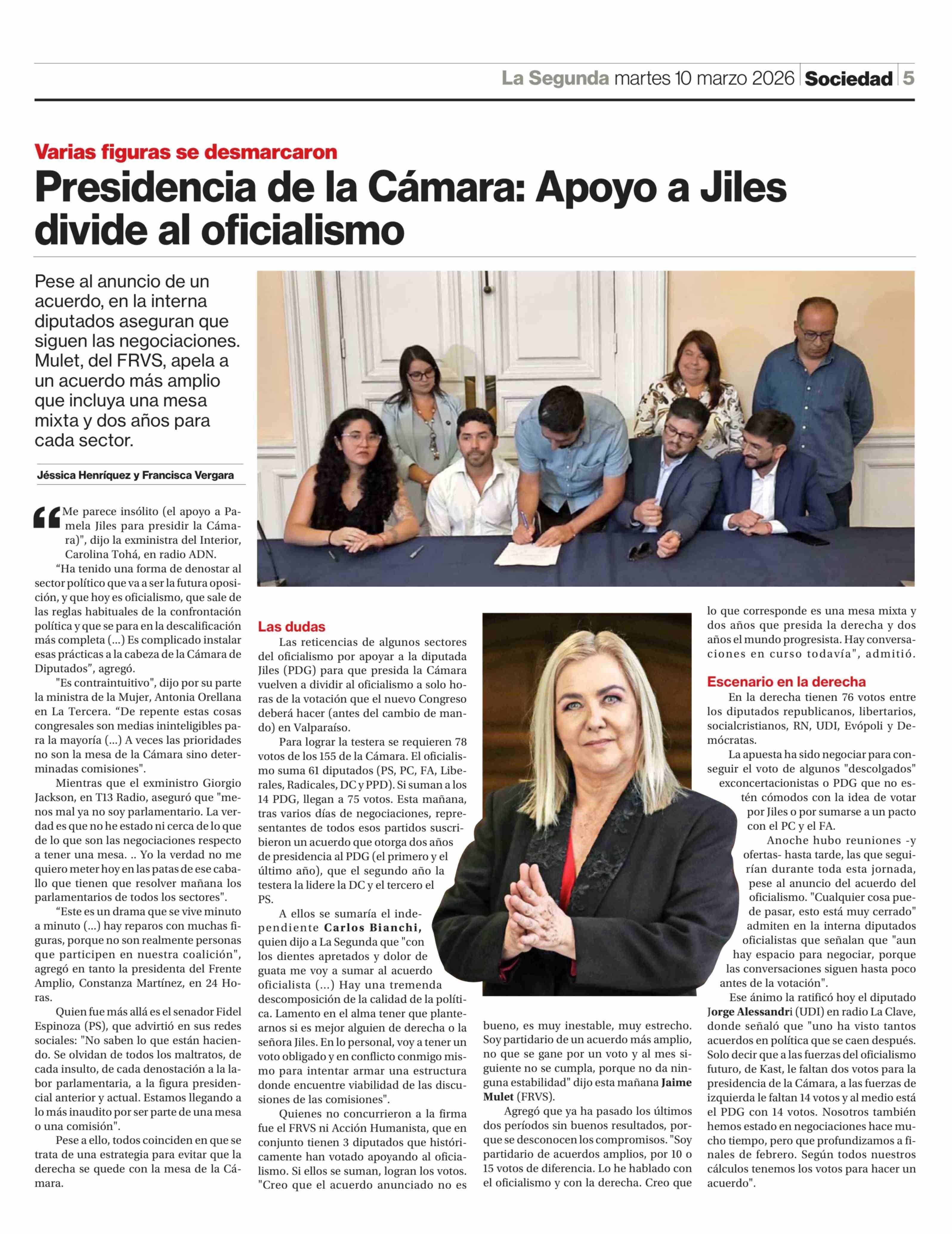 Presidencia de la Cámara: Apoyo a Jiles divide al oficialismo 10-03-2026 La Segunda |