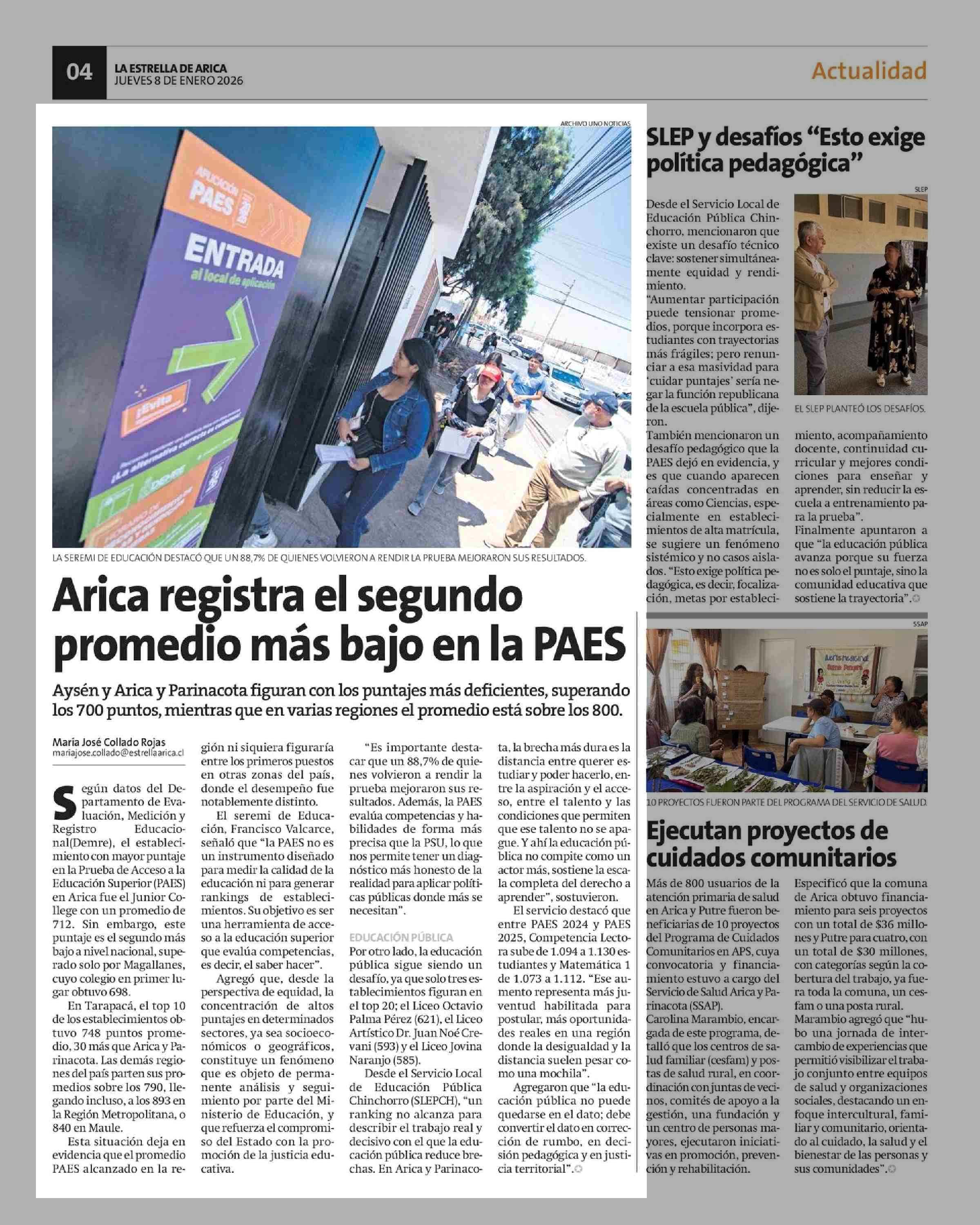 Arica registra el segundo promedio más bajo en la PAES 08-01-2026 La Estrella de Arica |