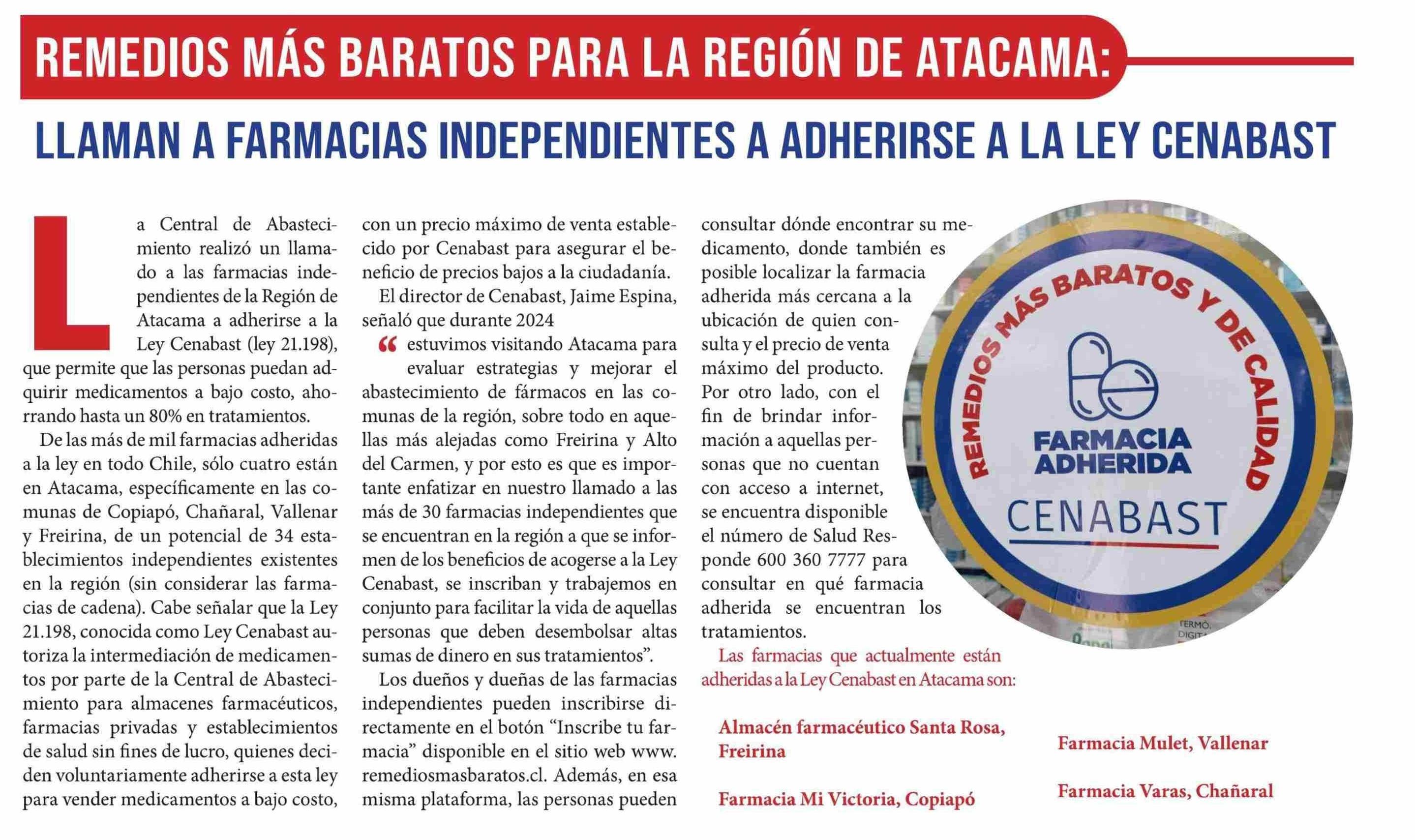 REMEDIOS MÁS BARATOS PARA LA REGIÓN DE ATACAMA: LLAMAN A FARMACIAS INDEPENDIENTES A ADHERIRSE A LA LEY CENABAST 29-12-2024 Diario Chañarcillo |