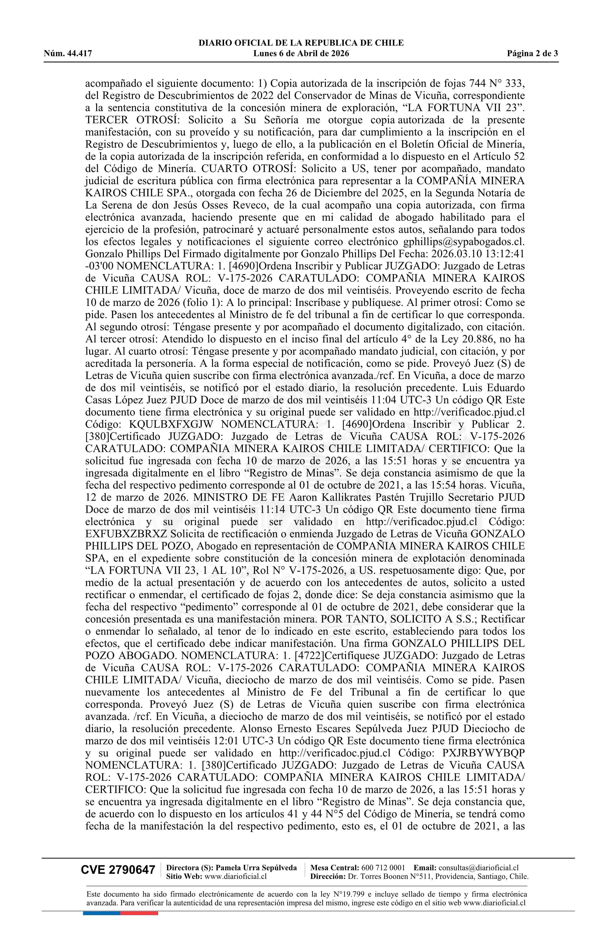 LA FORTUNA VII 23, 1 AL 10 / Compañía Minera Kairos Chile SpA 06-04-2026 DIARIO OFICIAL CHILE - BOLETÍN OFICIAL DE MINERÍA |