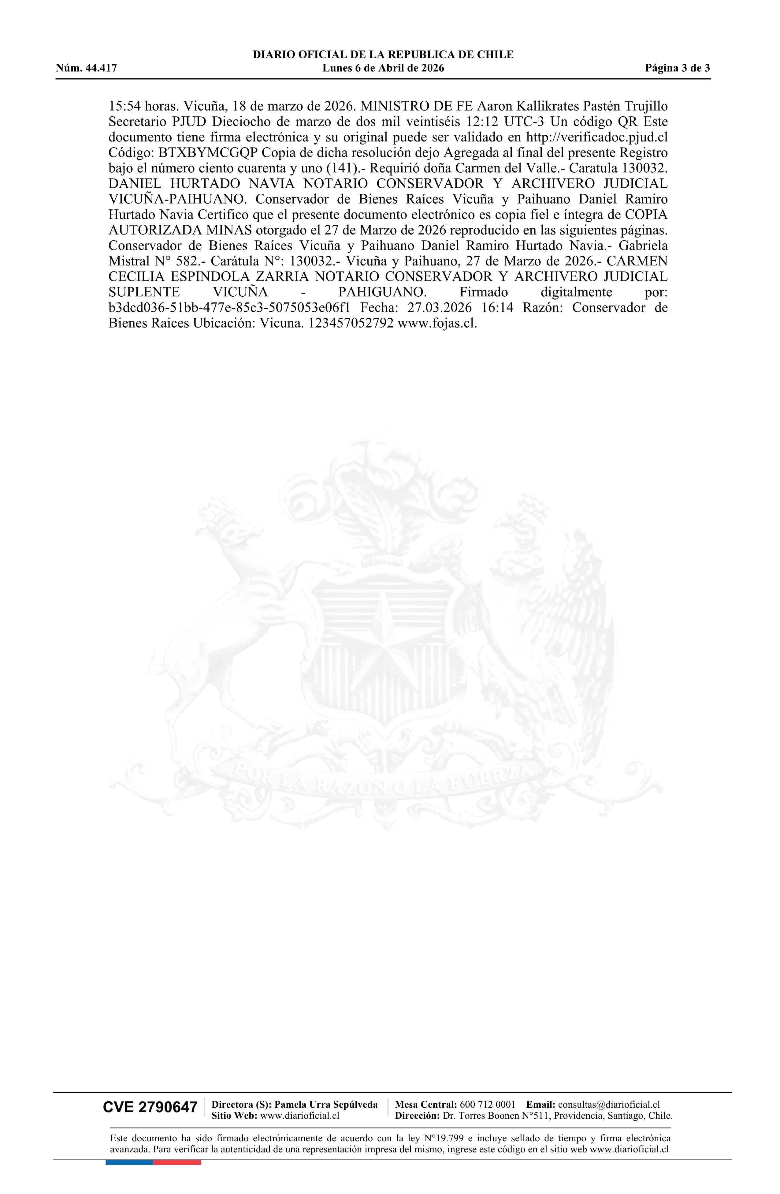 | Fuente: | DIARIO OFICIAL CHILE - BOLETÍN OFICIAL DE MINERÍA (DIARIO OFICIAL CHILE – BOM – MANIFESTACIONES MIN) | Página(s): | 35-37 |