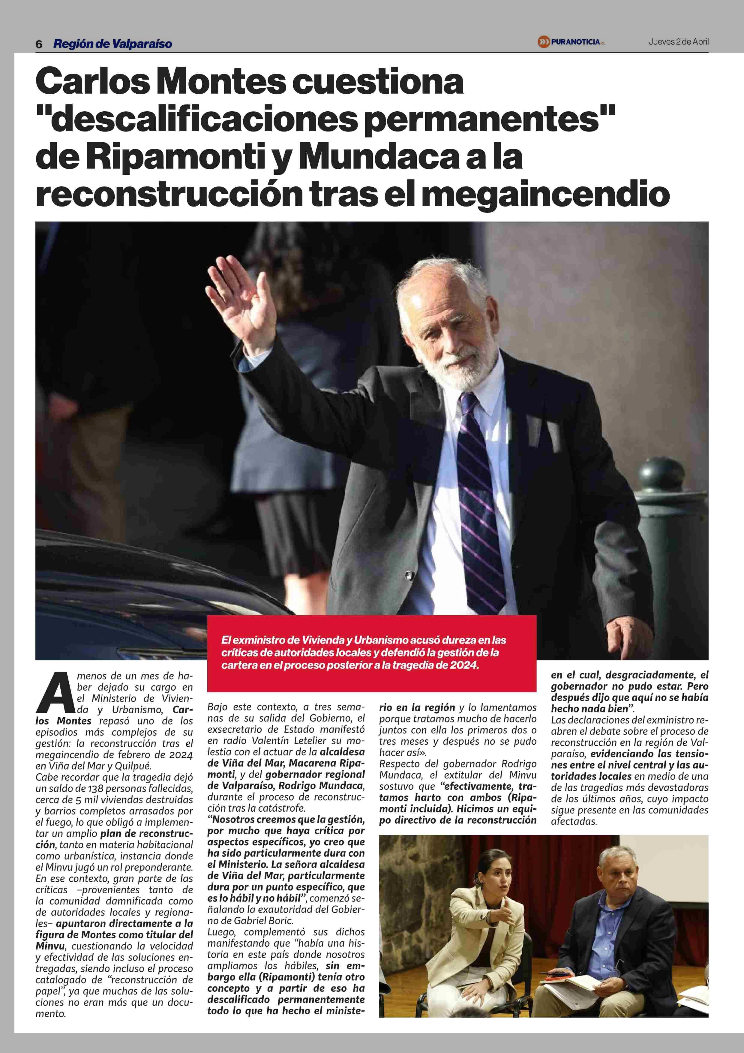 Carlos Montes cuestiona "descalificaciones permanentes” de Ripamonti y Mundaca a la reconstrucción tras el megaincendio 02-04-2026 Puranoticia.cl |
