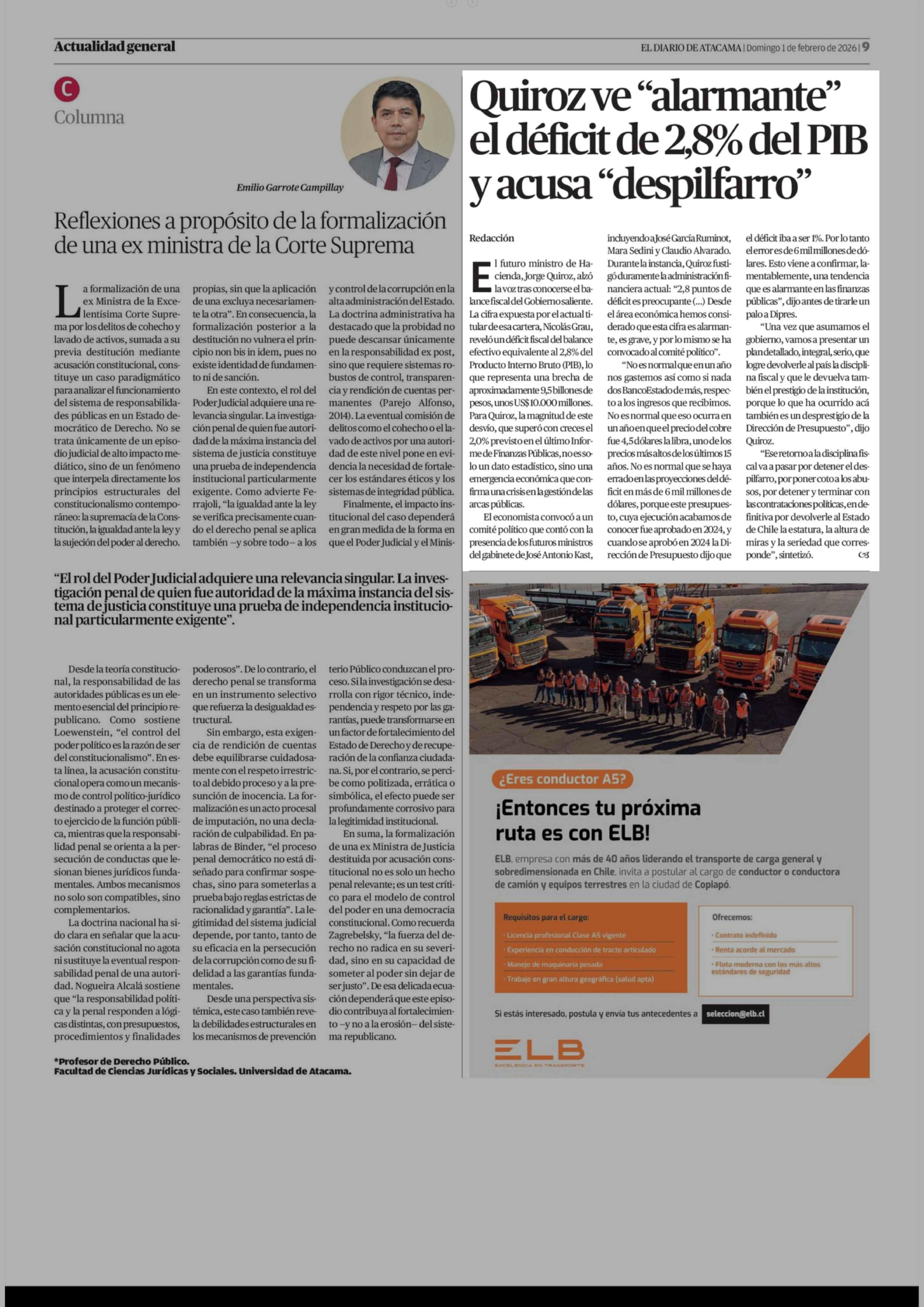 Quiroz ve "alarmante" el déficit de 2,8% del PIB y acusa "despilfarro" 01-02-2026 El Diario de Atacama |