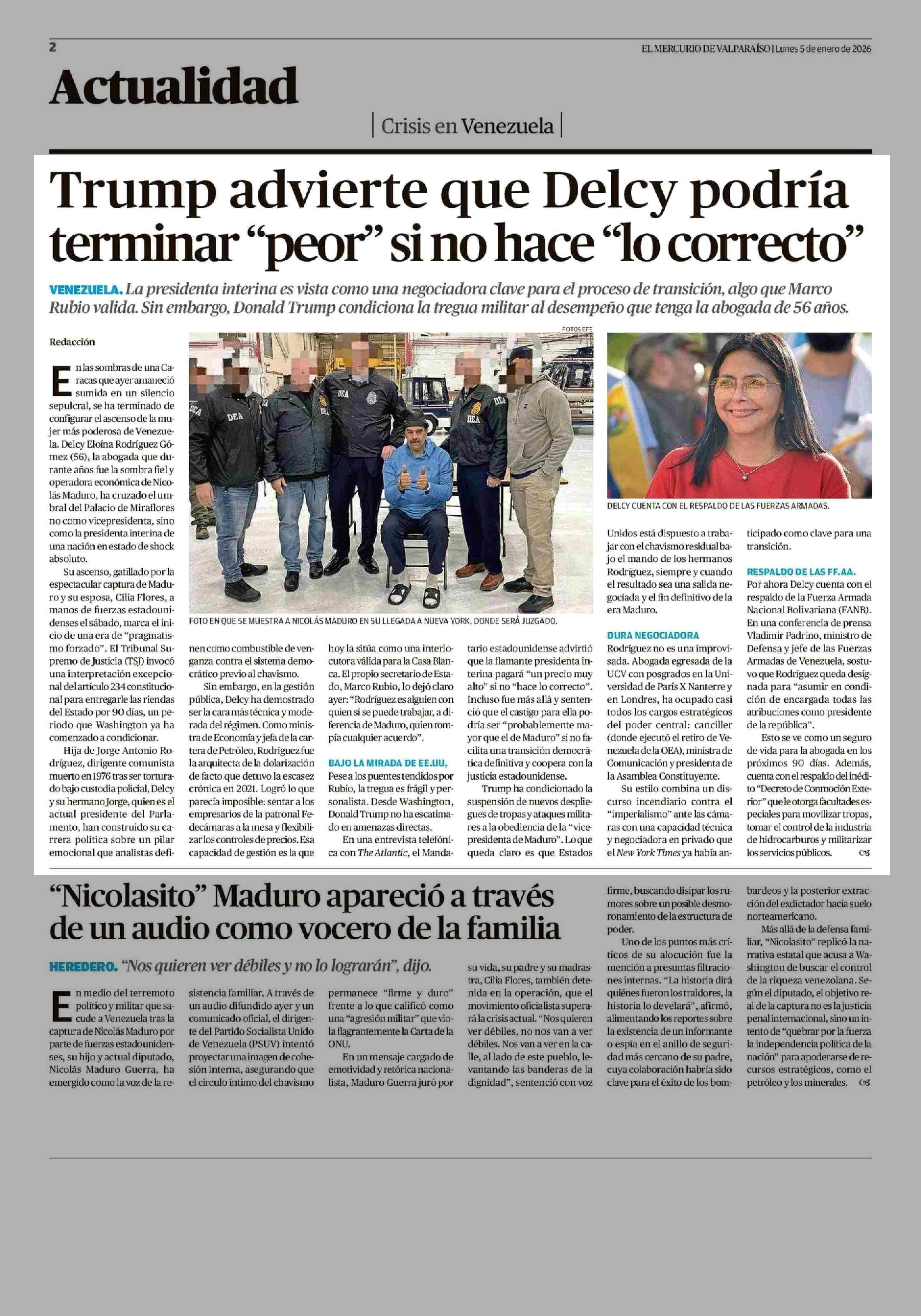 Trump advierte que Delcy podría terminar "peor" si no hace "lo correcto" 05-01-2026 El Mercurio de Valparaíso |
