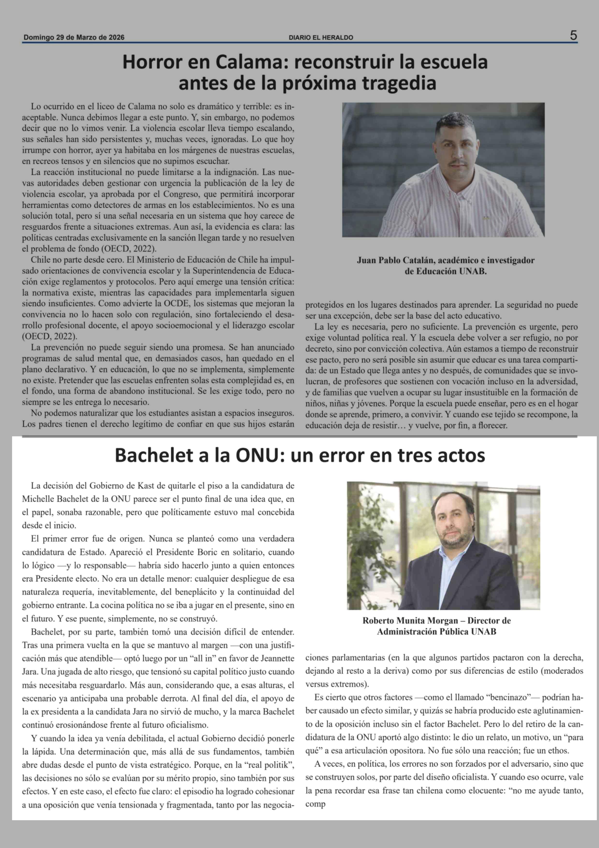 Columnas de Opinión: Bachelet a la ONU: un error en tres actos 29-03-2026 El Heraldo |