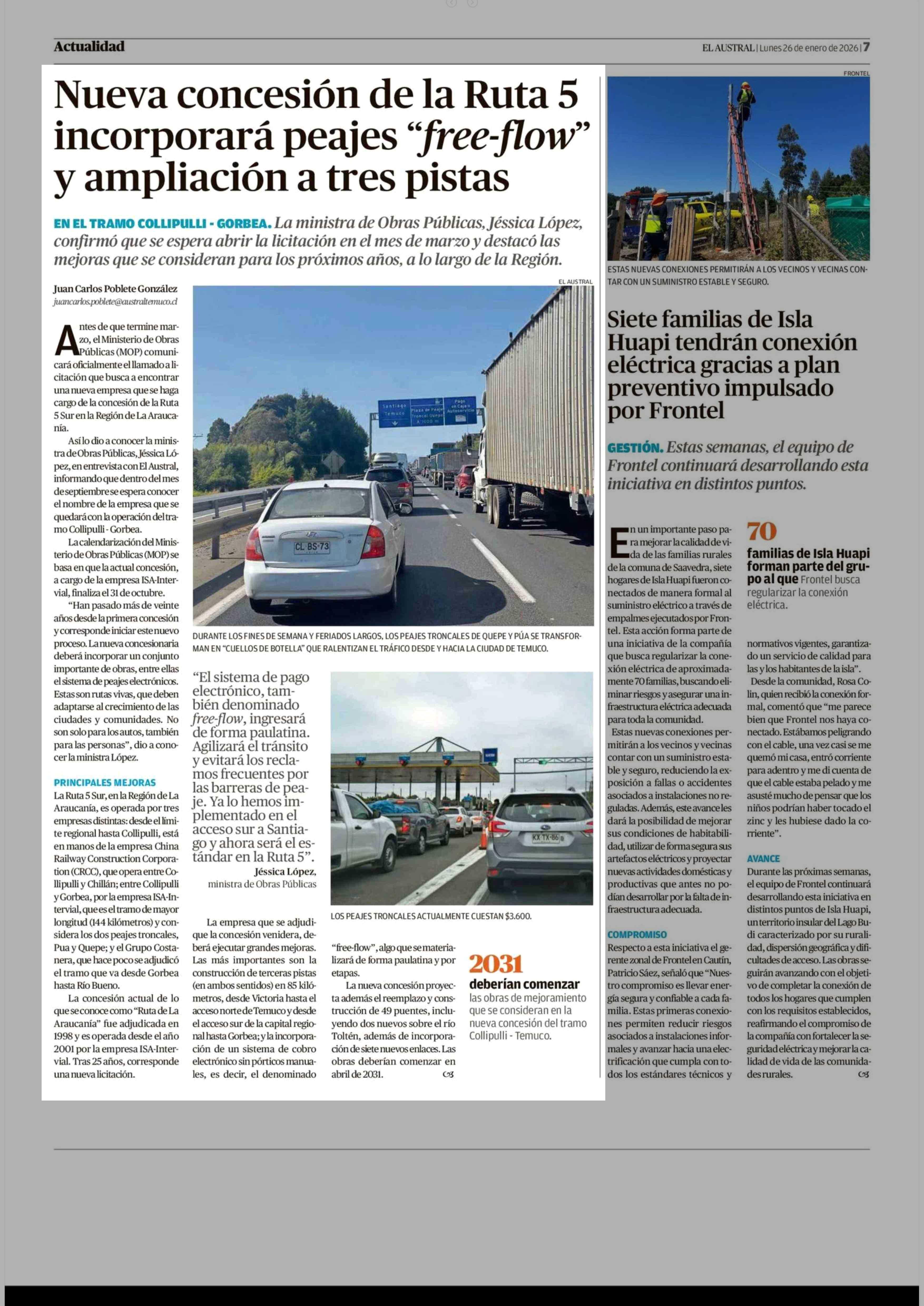 Nueva concesión de la Ruta 5 incorporará peajes "free-flow" y ampliación a tres pistas 26-01-2026 El Austral de la Araucanía |