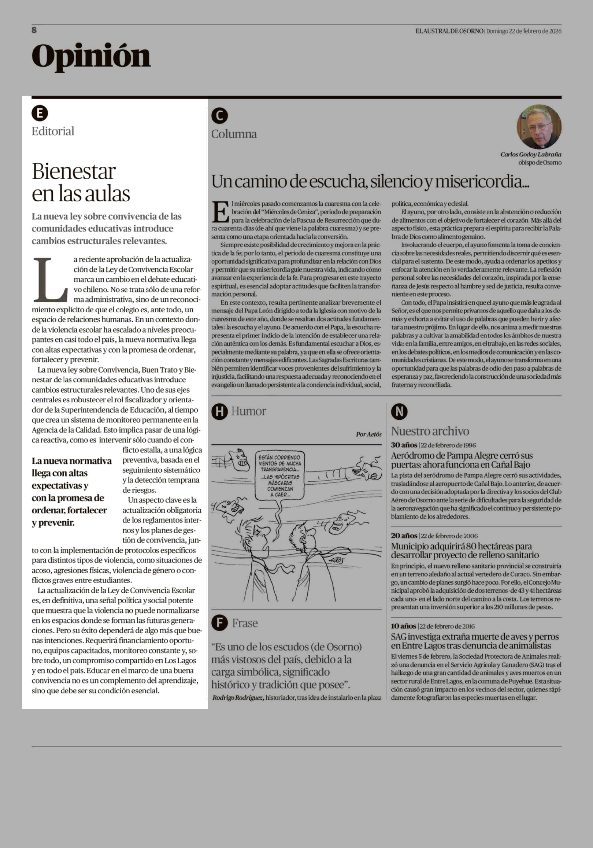 Editorial: Bienestar en las aulas 22-02-2026 El Austral de Osorno |