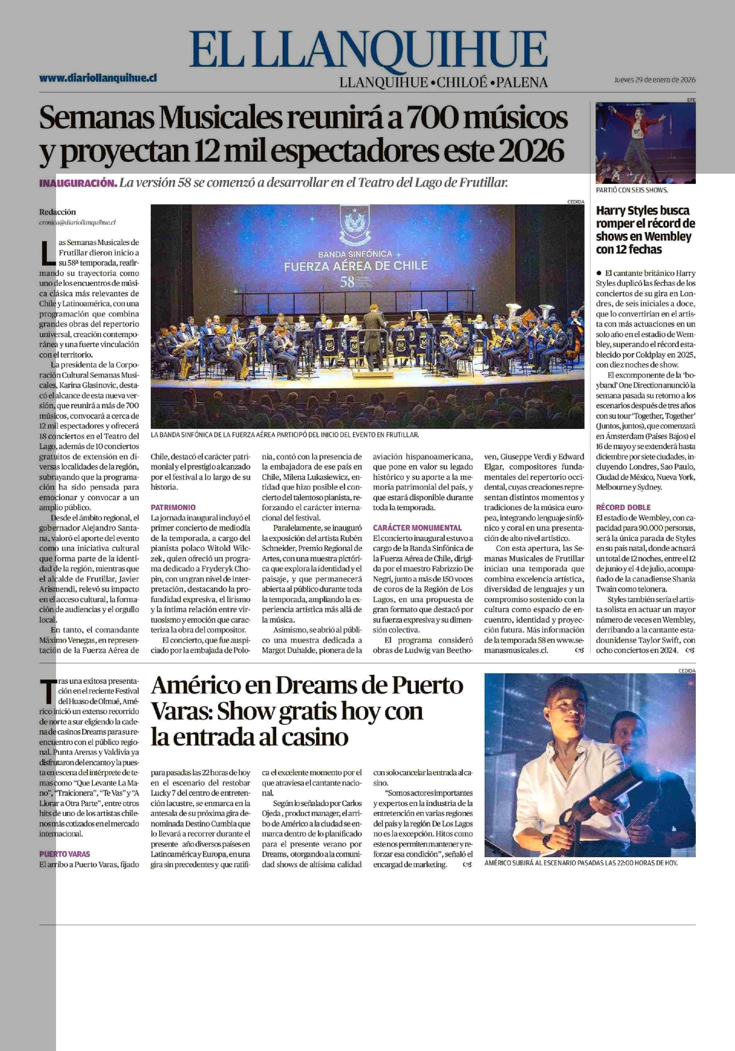 Semanas Musicales reunirá a 700 músicos y proyectan 12 mil espectadores este 2026 29-01-2026 El Llanquihue |