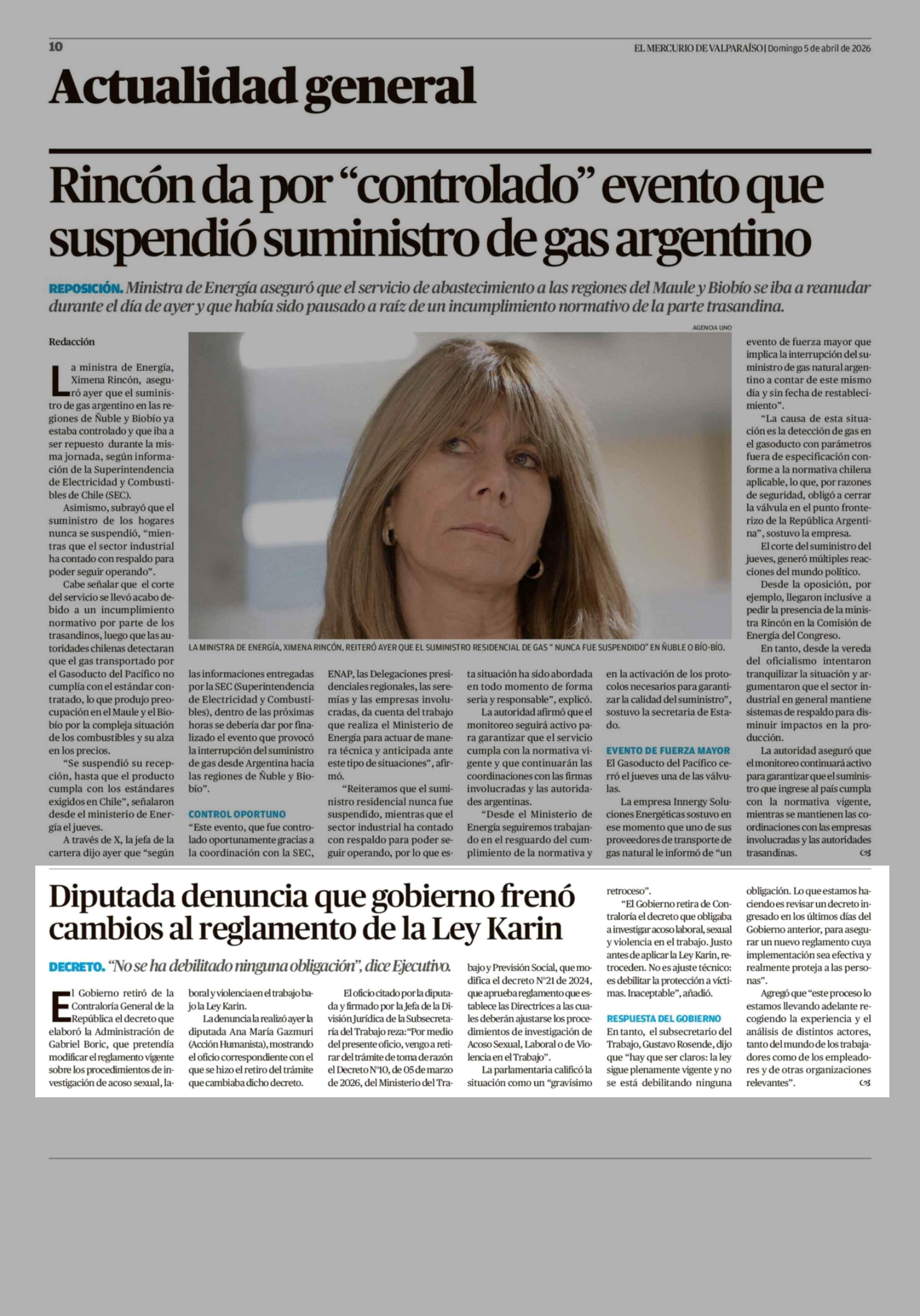 Diputada denuncia que gobierno frenó cambios al reglamento de la Ley Karin 05-04-2026 El Mercurio de Valparaíso |