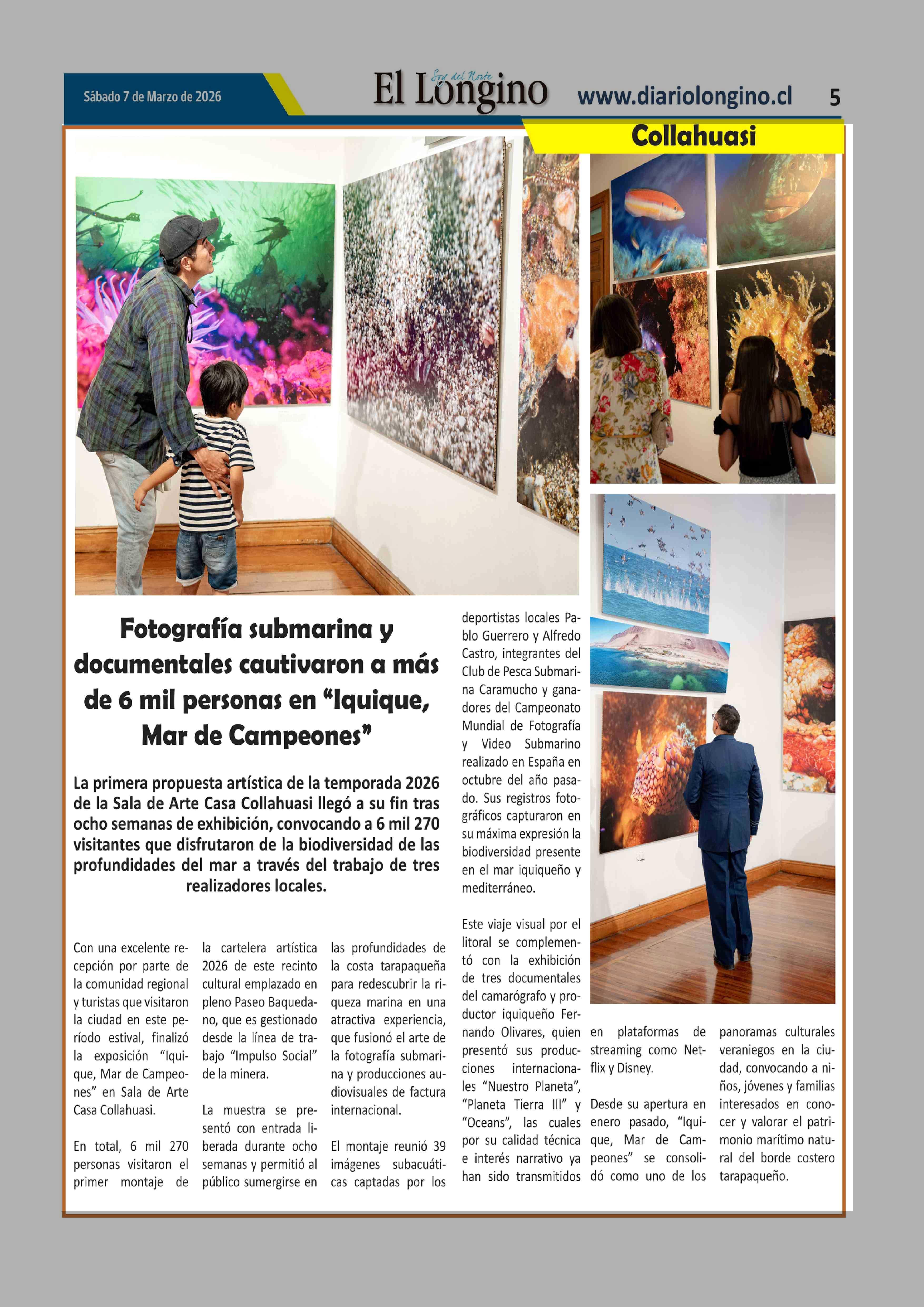 Fotografía submarina y documentales cautivaron a más de 6 mil personas en "Iquique, Mar de Campeones" 07-03-2026 El Longino |