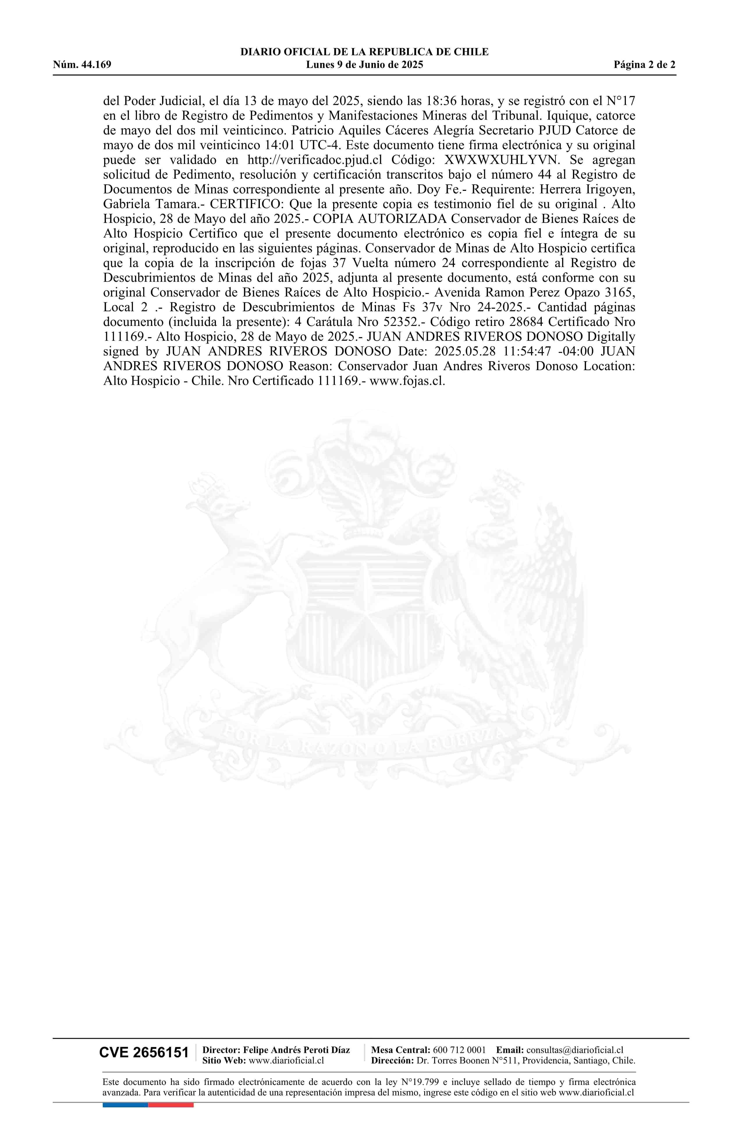 CARO 13 / Compañía Minera Cerro Colorado Limitada 09-06-2025 DIARIO OFICIAL CHILE - BOLETÍN OFICIAL DE MINERÍA |