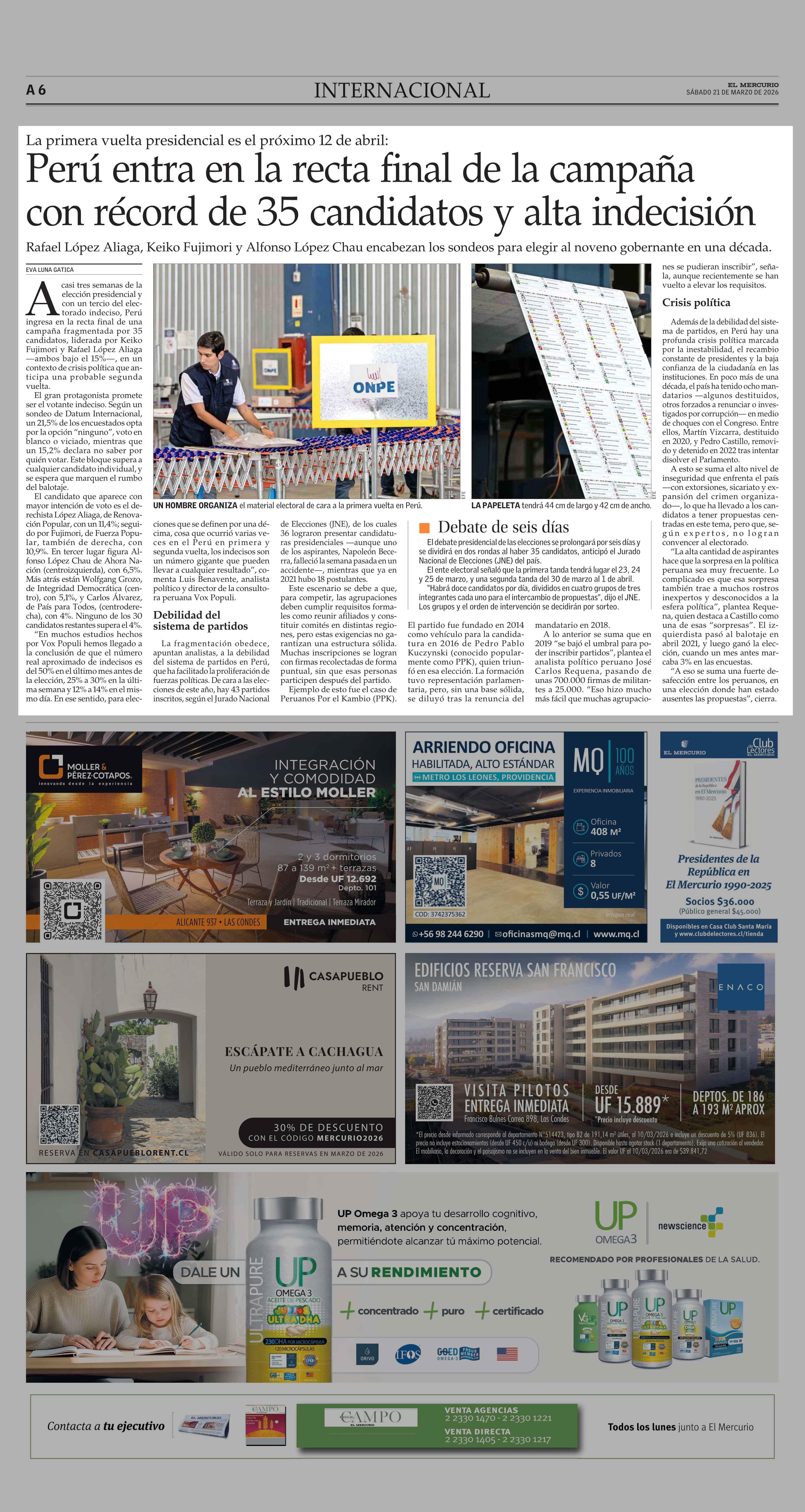 Perú entra en la recta final de la campaña con récord de 35 candidatos y alta indecisión 21-03-2026 El Mercurio |