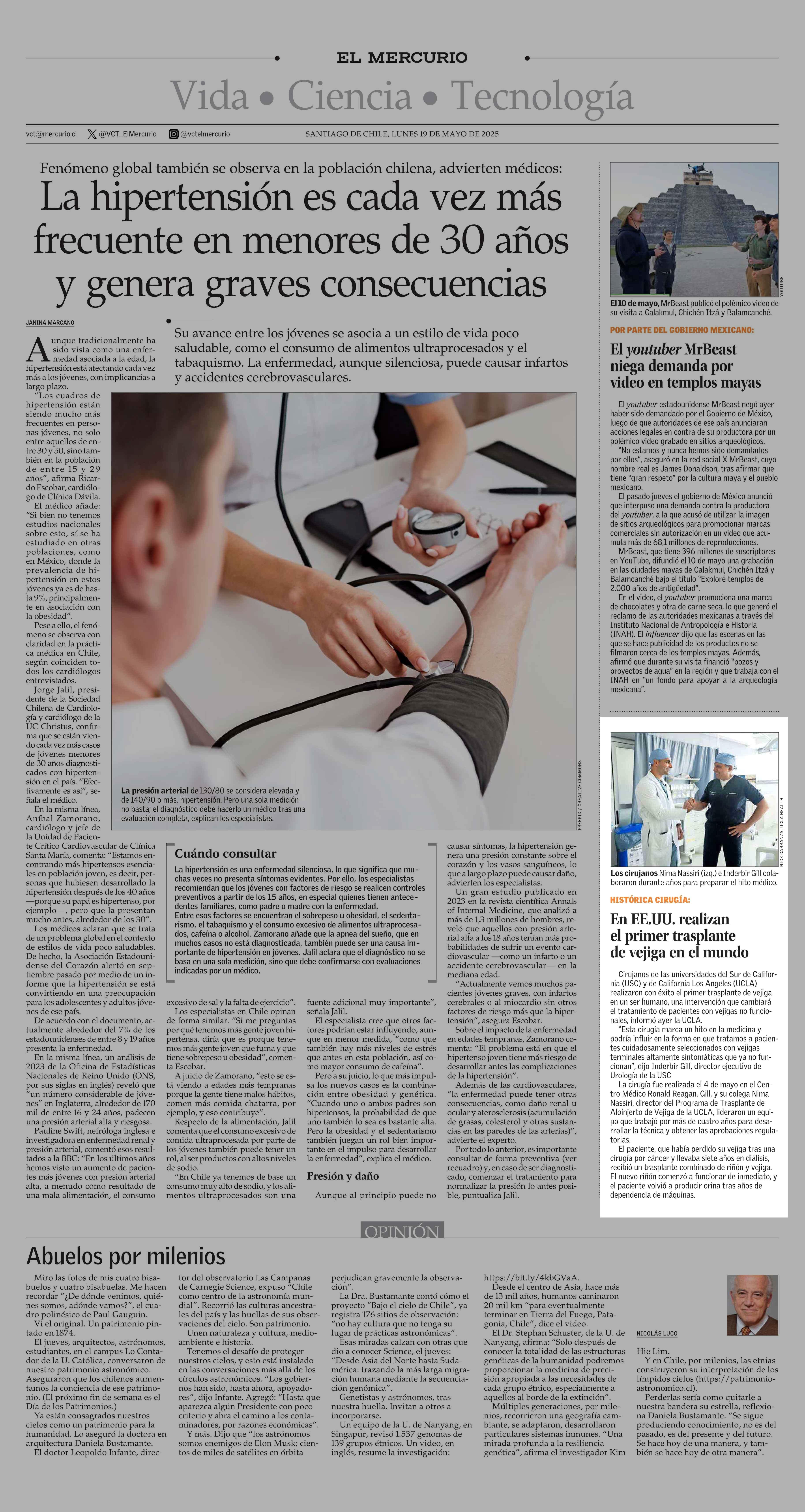En EE.UU. realizan el primer trasplante de vejiga en el mundo 19-05-2025 El Mercurio |