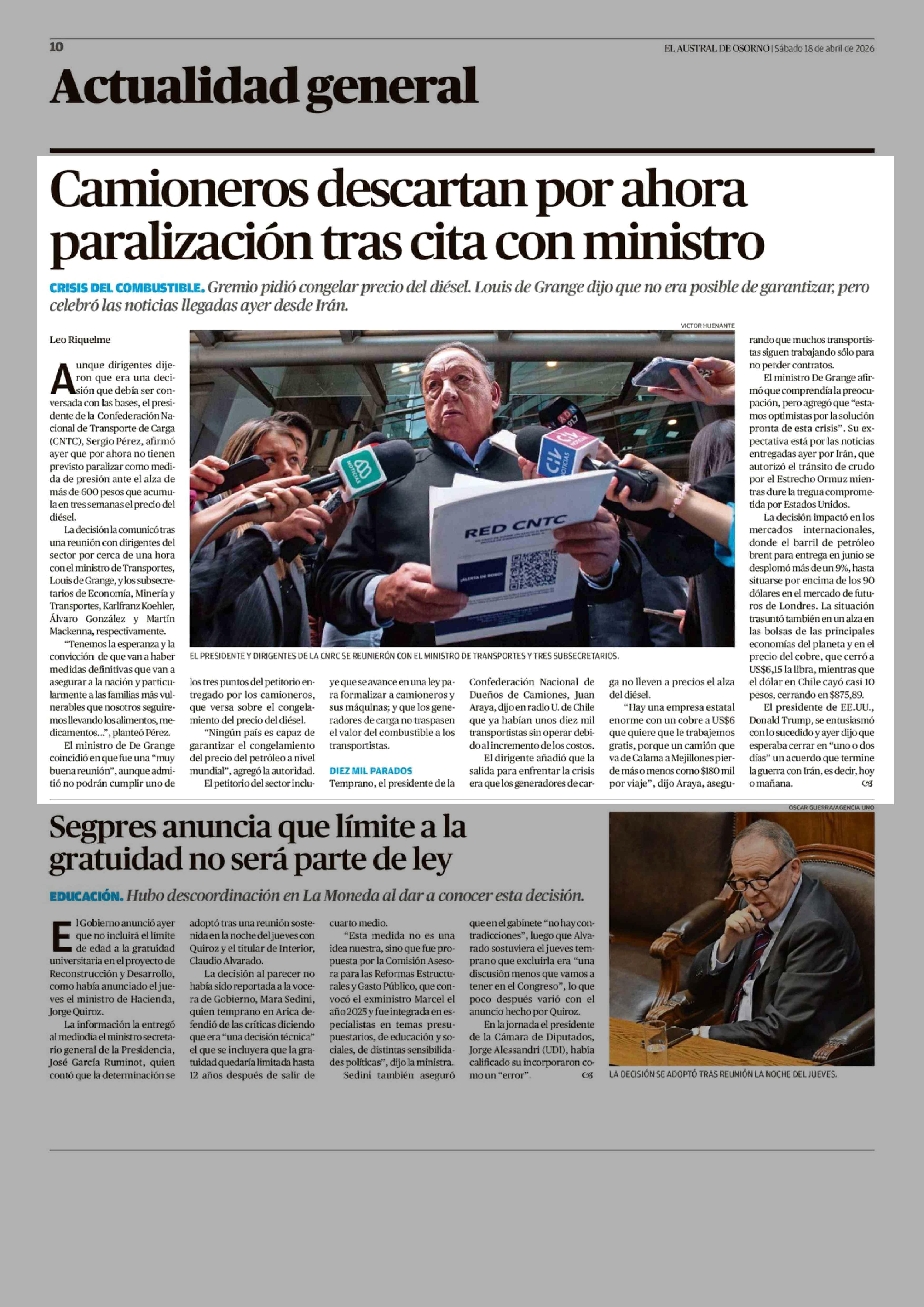 Camioneros descartan por ahora paralización tras cita con ministro 18-04-2026 El Austral de Osorno |