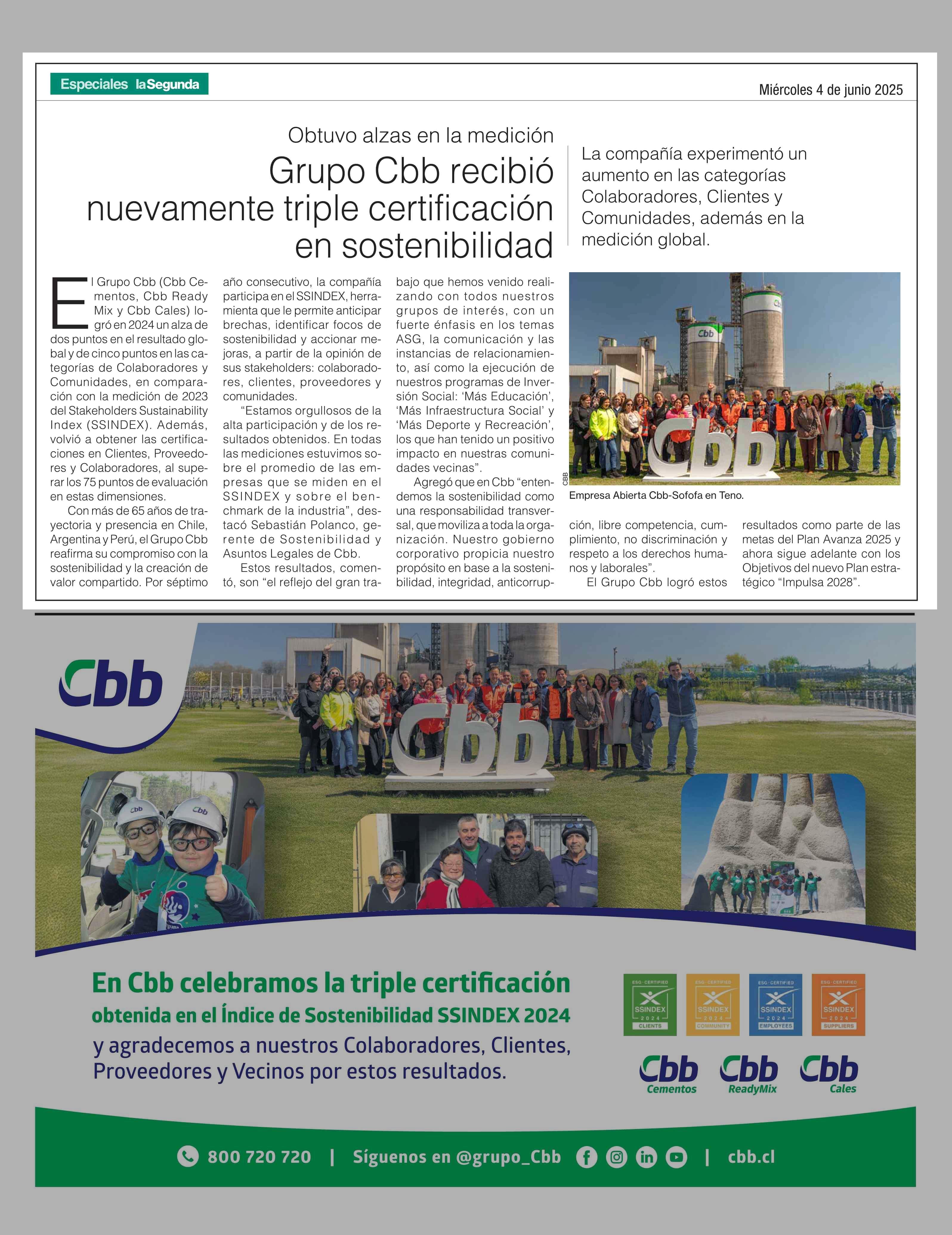 Grupo Cbb recibió nuevamente triple certificación en sostenibilidad 04-06-2025 La Segunda |