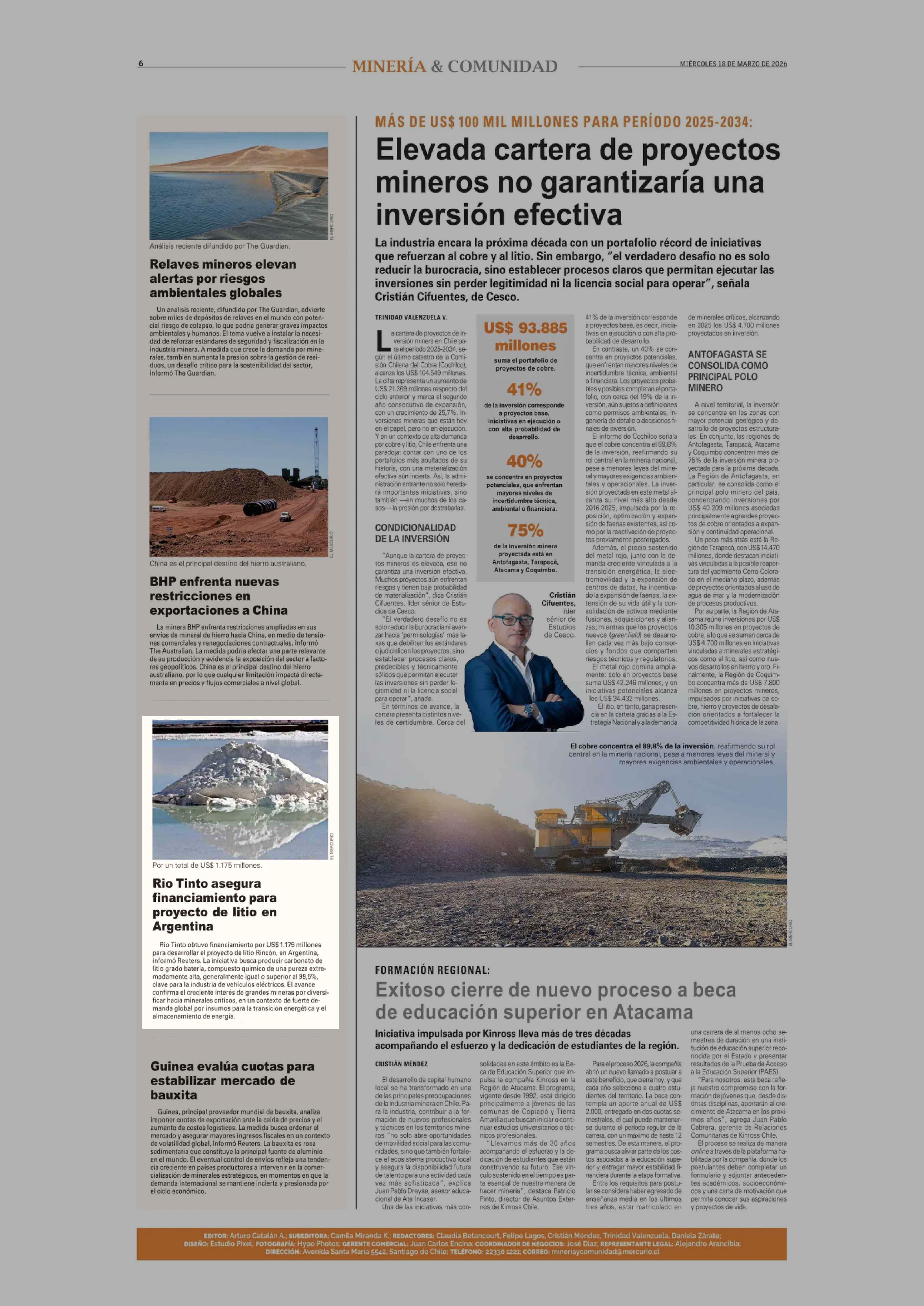 Rio Tinto asegura financiamiento para proyecto de litio en Argentina 18-03-2026 El Mercurio |