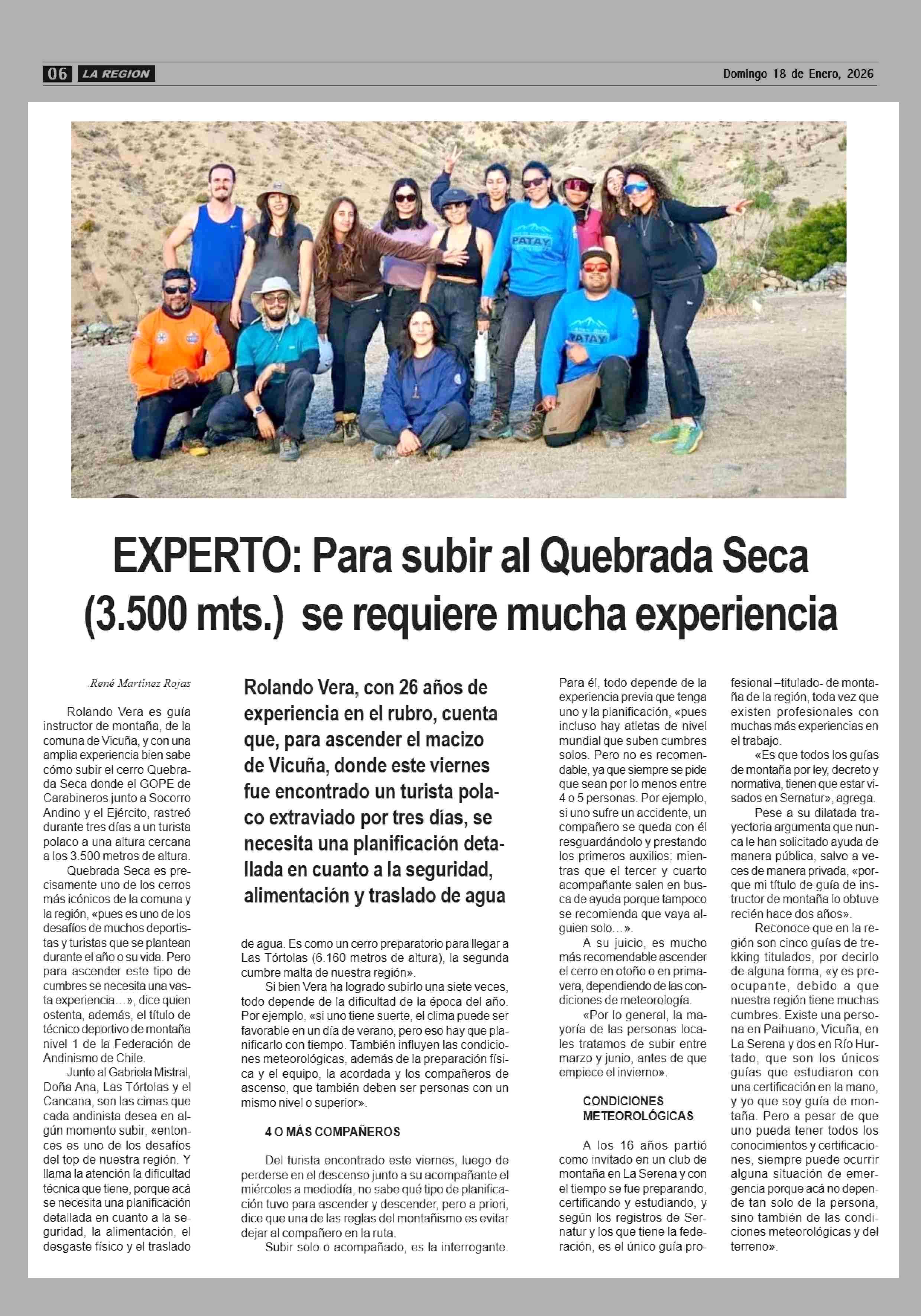 EXPERTO: Para subir al Quebrada Seca (3.500 mts.) se requiere mucha experiencia 18-01-2026 Diario la Región |