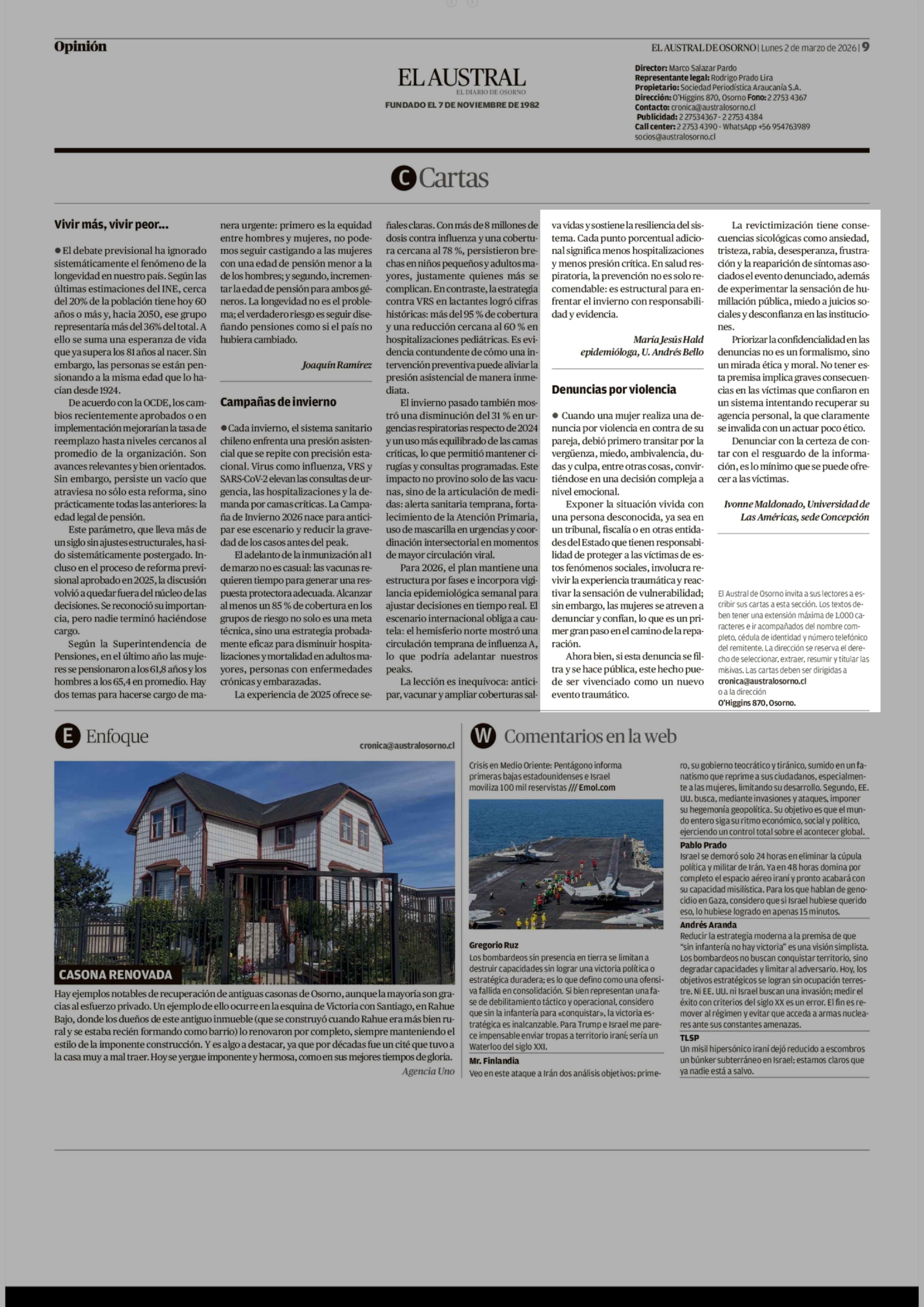 Cartas: Denuncias por violencia 02-03-2026 El Austral de Osorno |