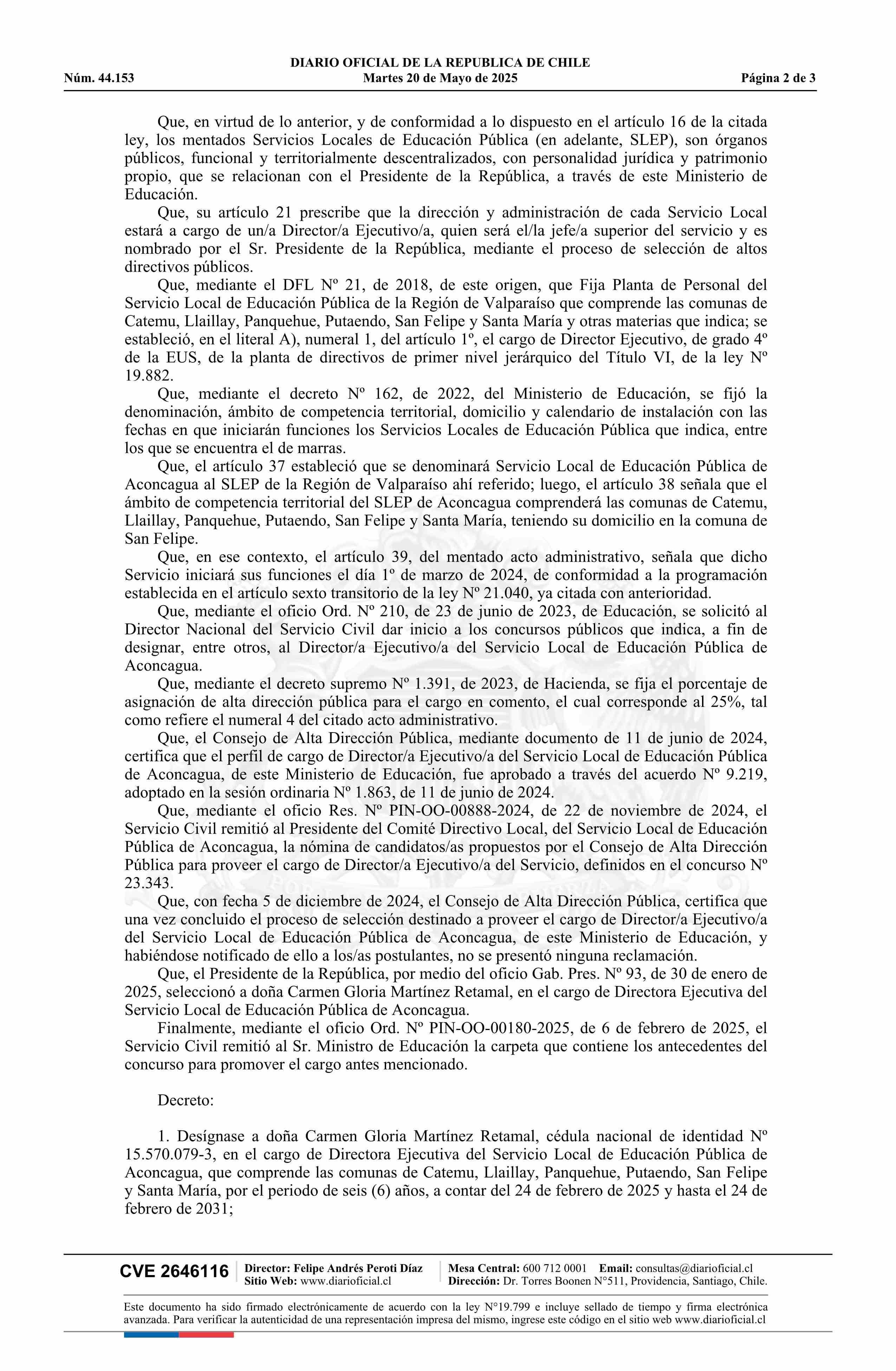 | Título: | Decreto número 34, de 2025.- Designa a doña Carmen Gloria Martínez Retamal como Directora Ejecutiva del Servicio Local de Educación Pública de Aconcagua, de conformidad al artículo 21 de la ley Nº 21.040 |