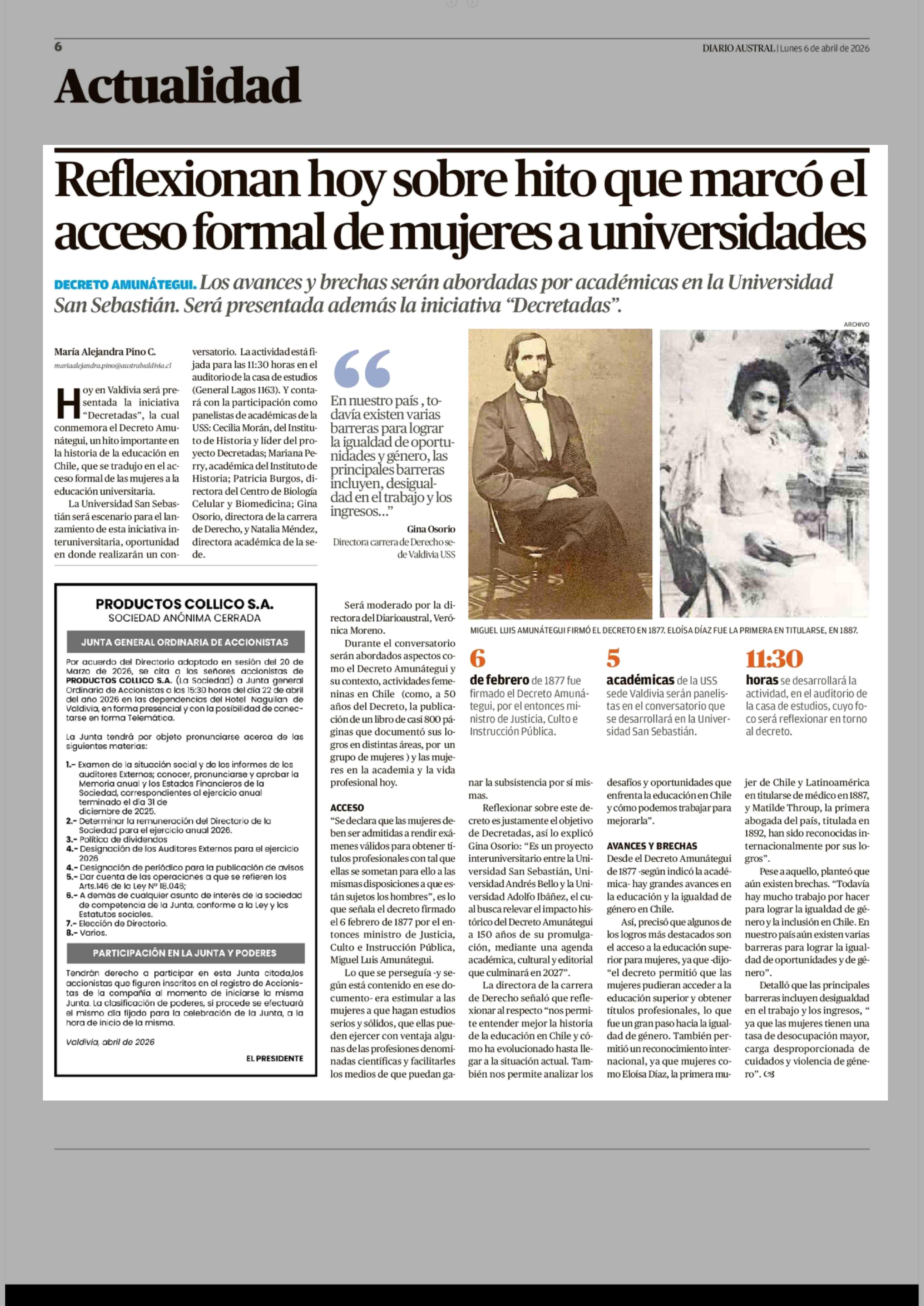 Reflexionan hoy sobre hito que marcó el acceso formal de mujeres a universidades 06-04-2026 Diario Austral Región de Los Ríos |