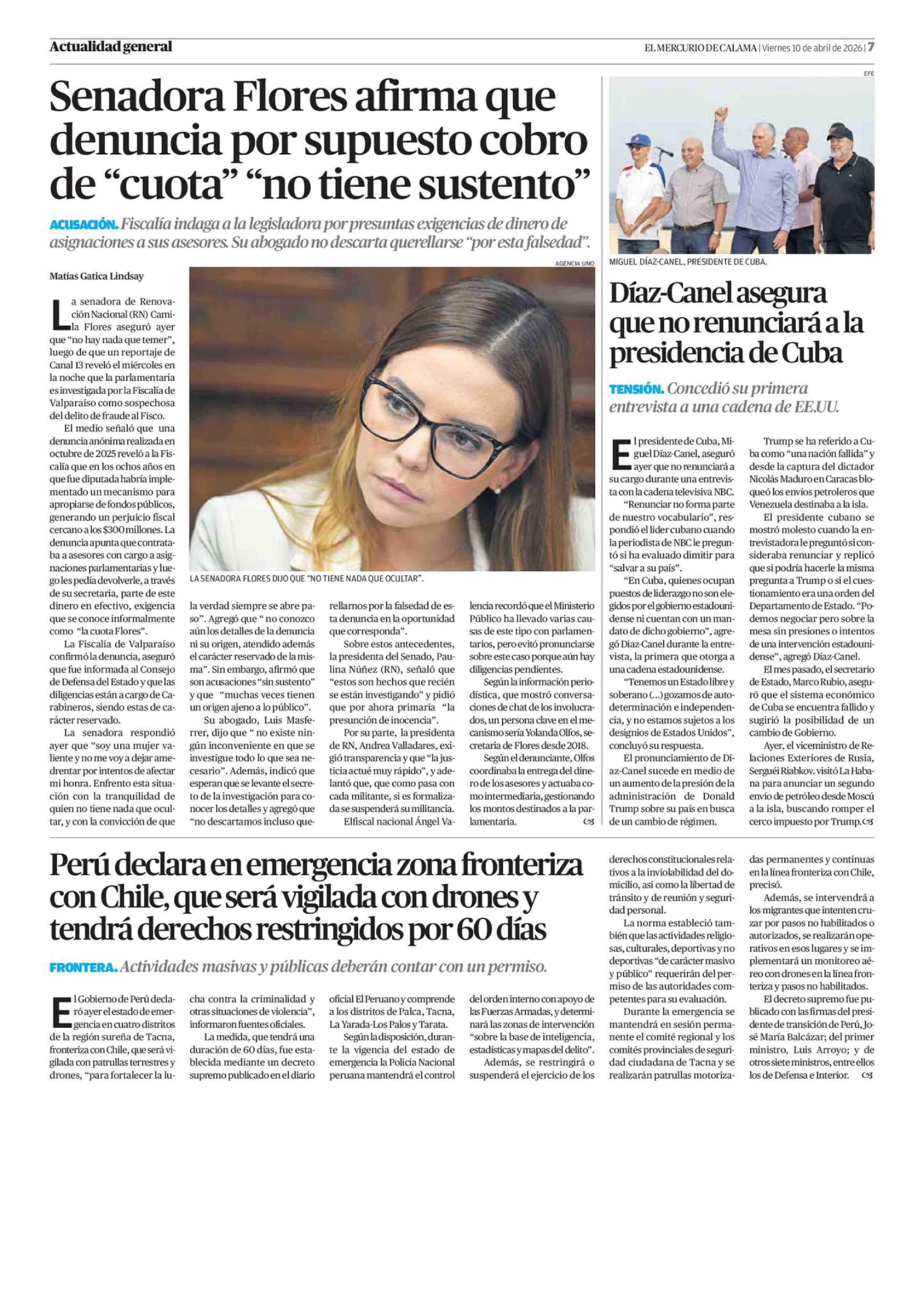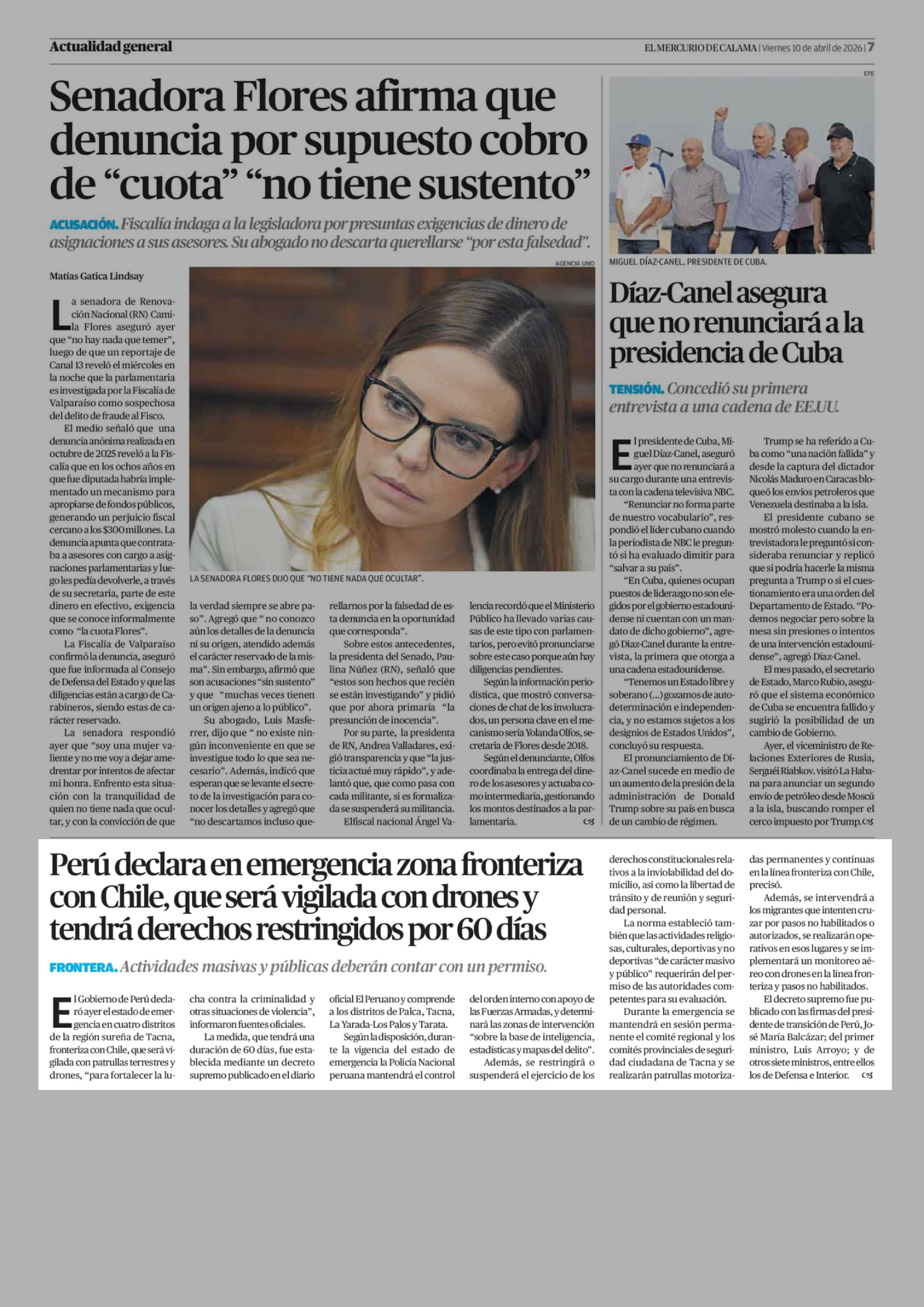Perú declara en emergencia zona fronteriza con Chile, que será vigilada con drones y tendrá derechos restringidos por 60 días 10-04-2026 El Mercurio de Calama |