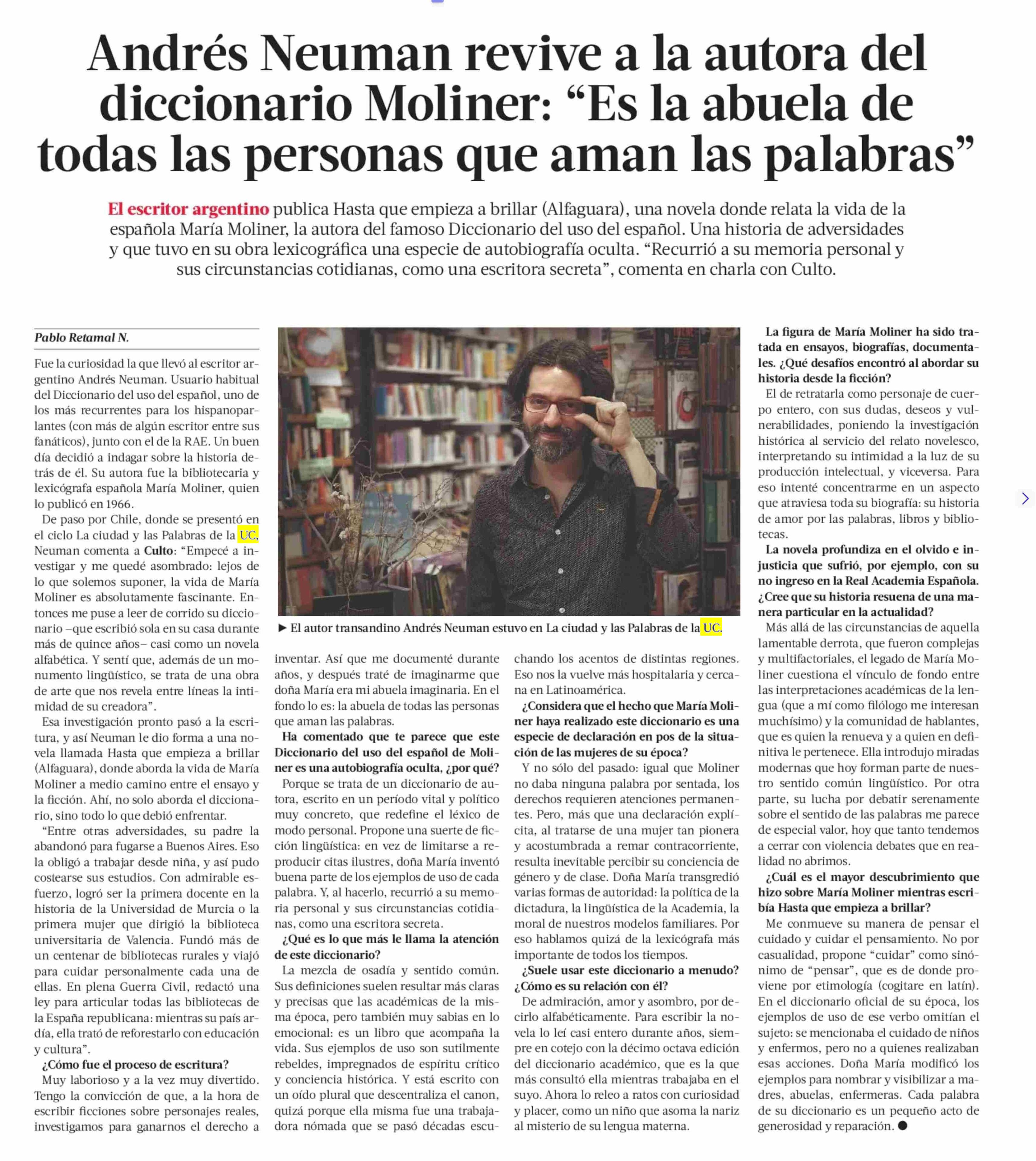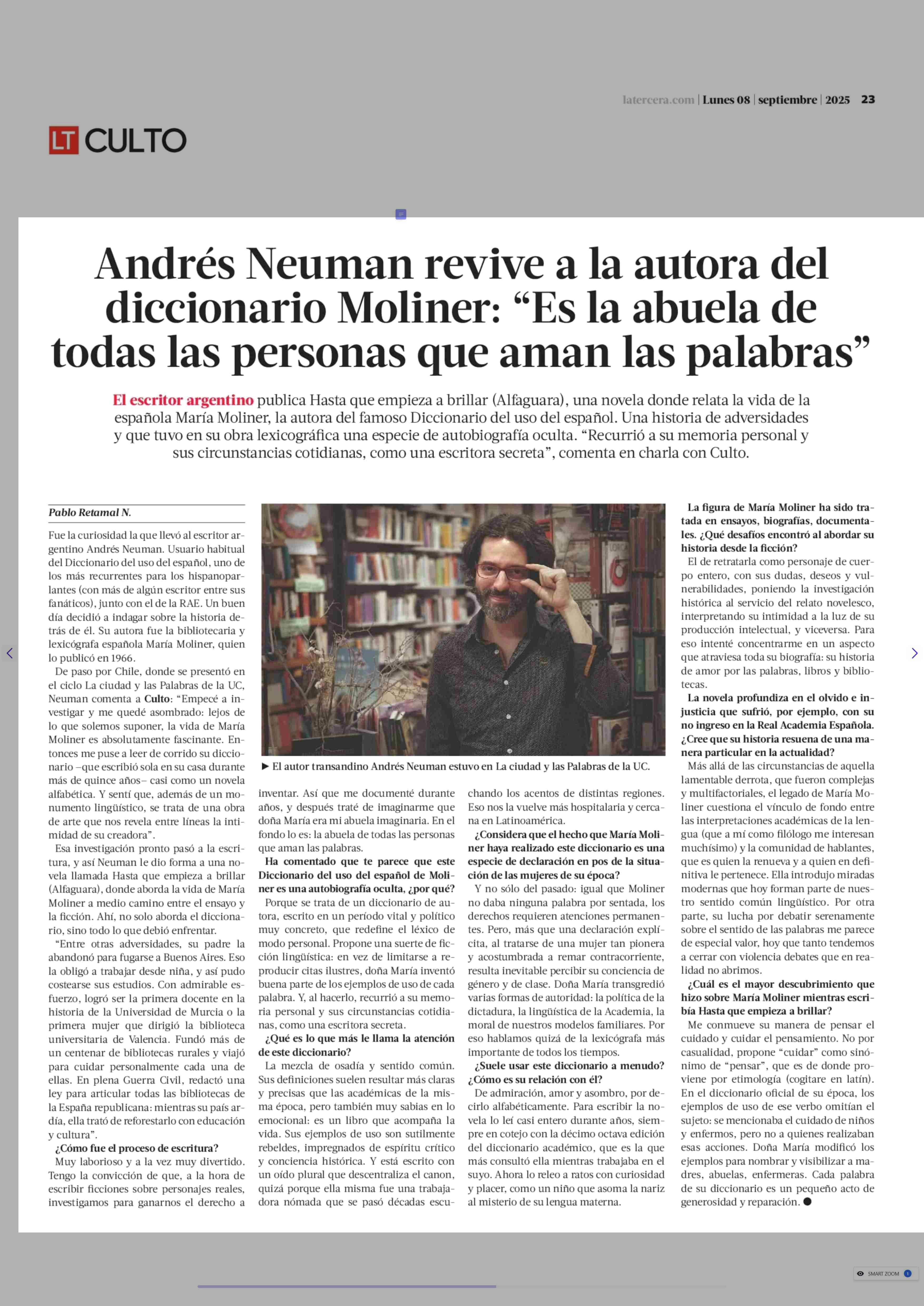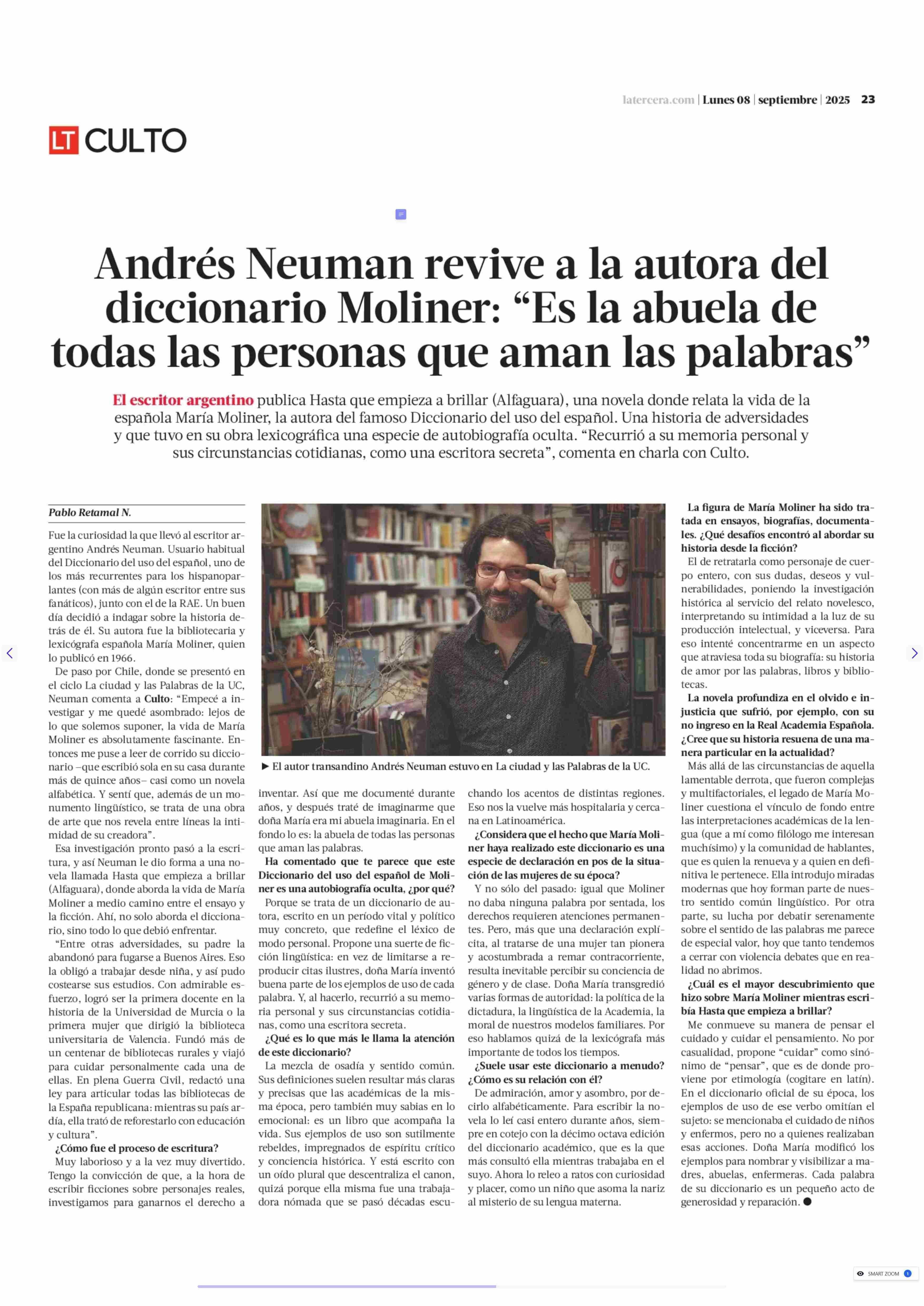 Andrés Neuman revive a la autora del diccionario Moliner: “Es la abuela de todas las personas que aman las palabras” 08-09-2025 La Tercera |