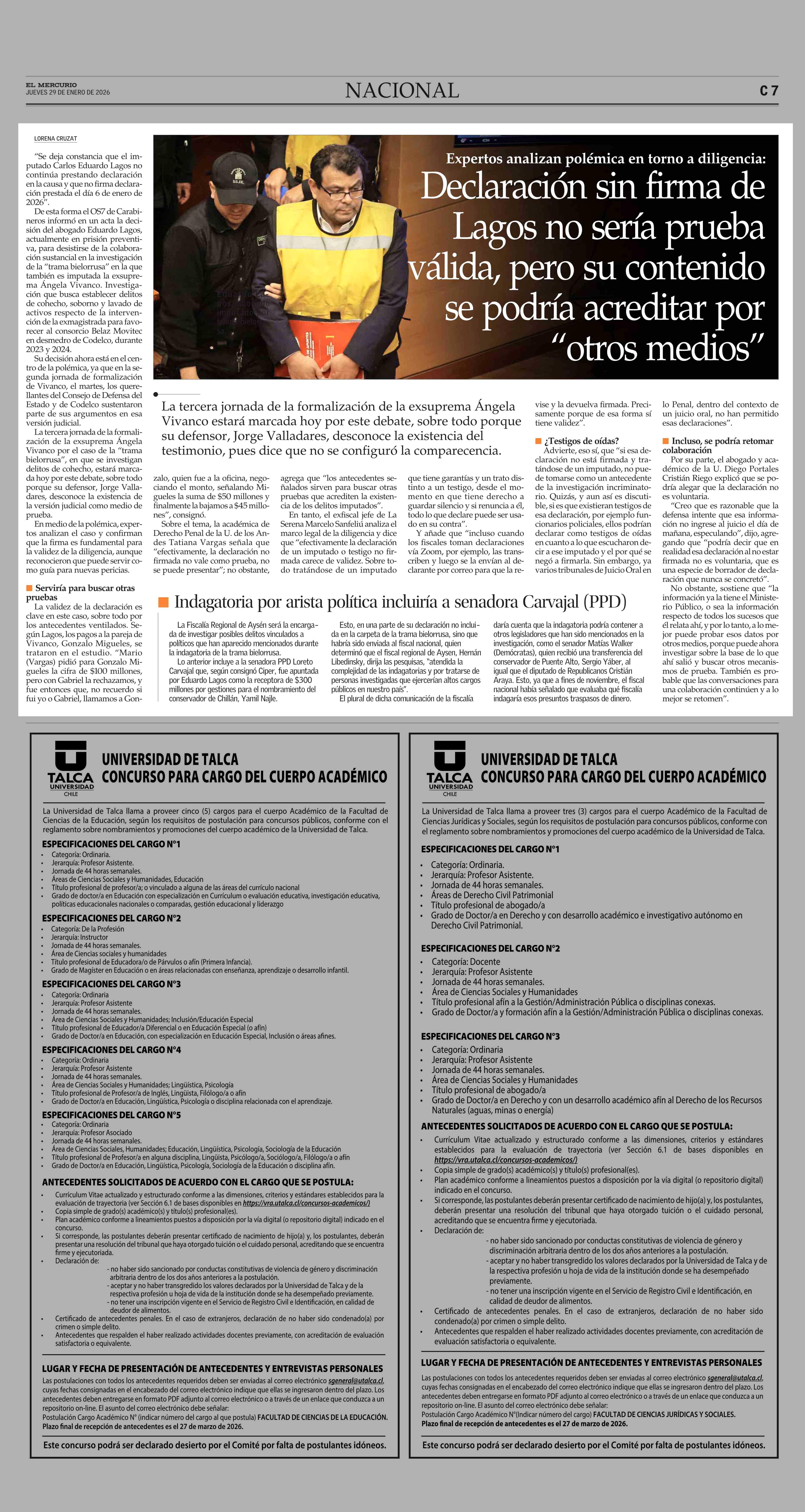 Declaración sin firma de Lagos no sería prueba válida, pero su contenido se podría acreditar por “otros medios” 29-01-2026 El Mercurio |