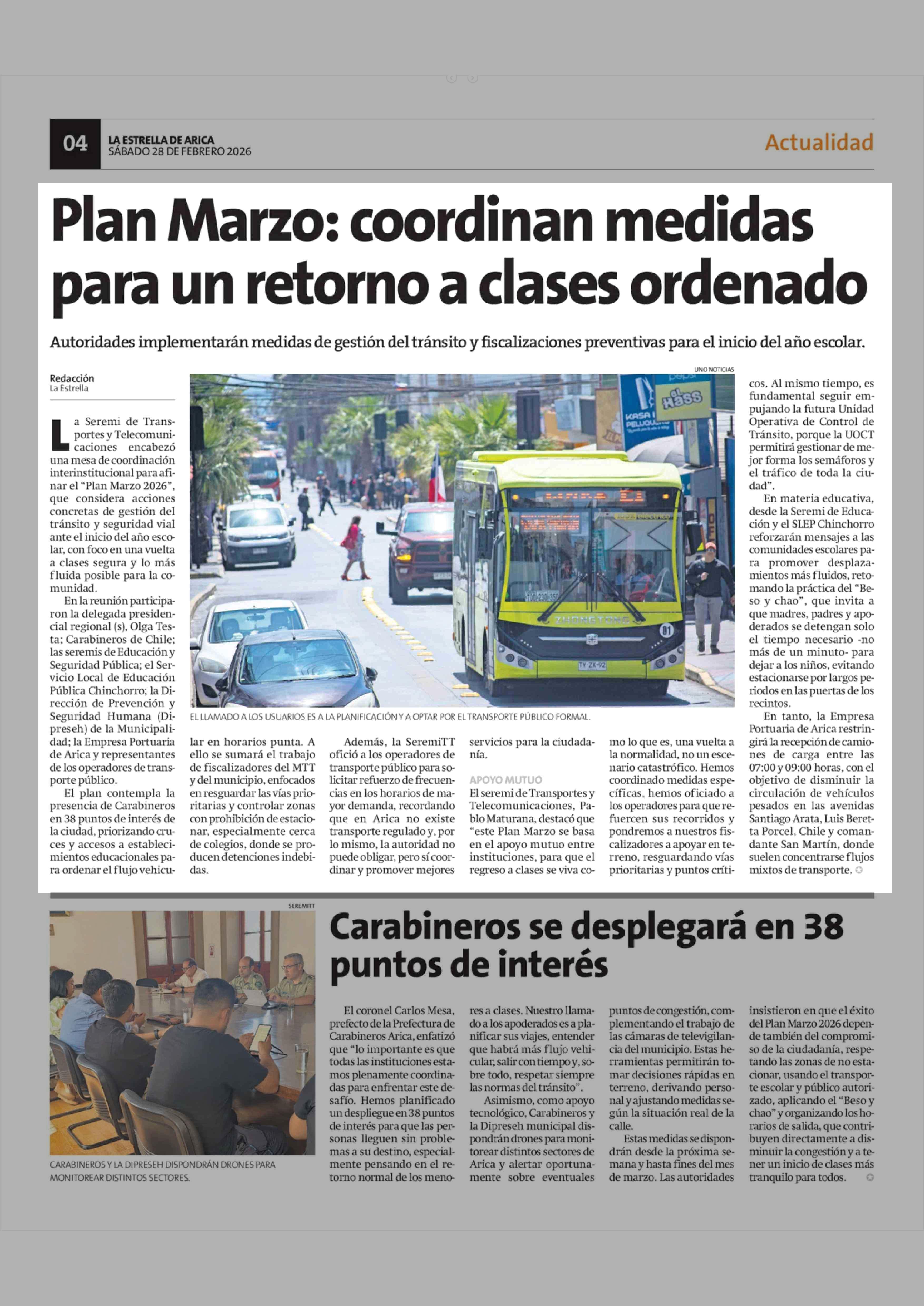 Plan Marzo: coordinan medidas para un retorno a clases ordenado 28-02-2026 La Estrella de Arica |