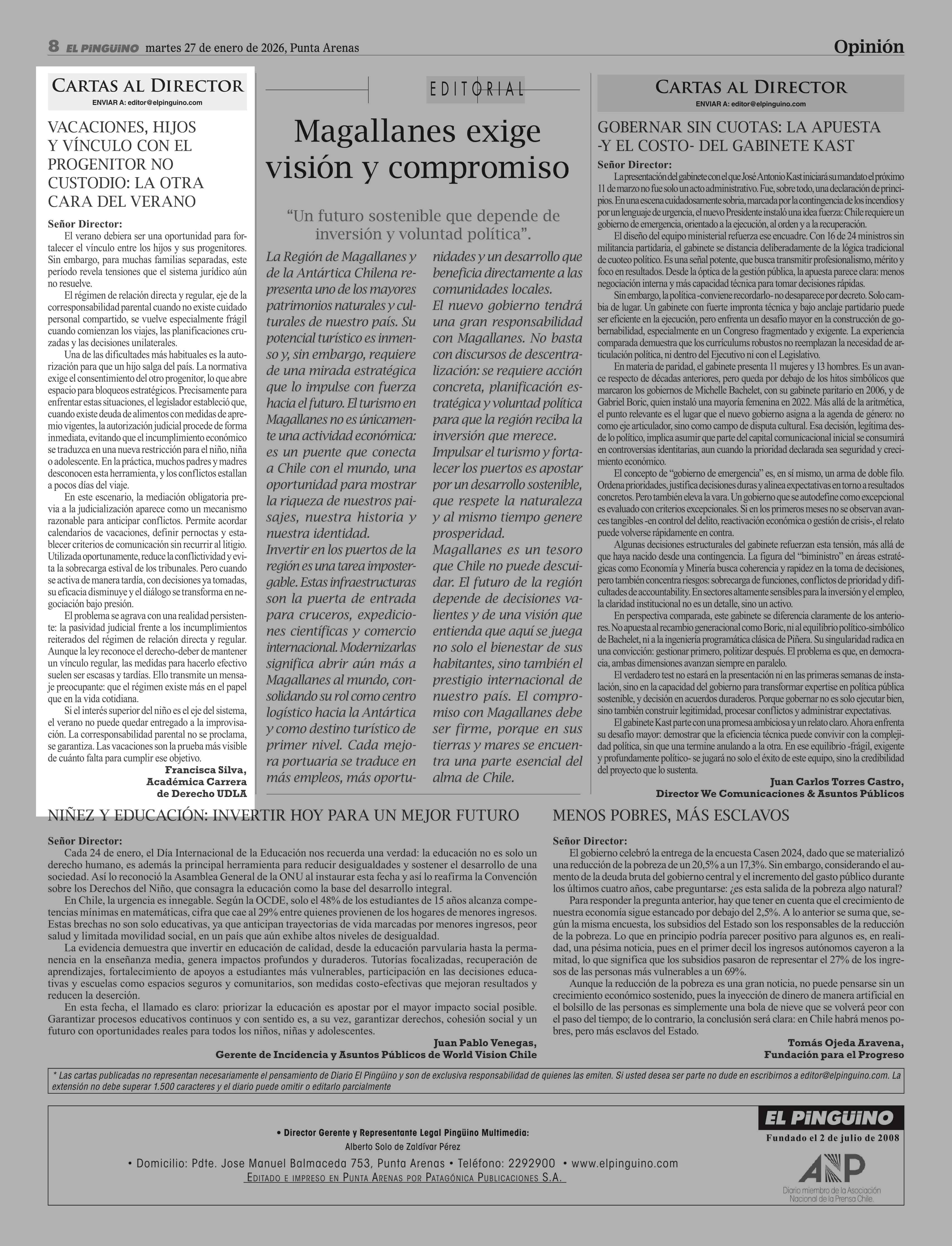 Cartas: VACACIONES, HIJOS Y VÍNCULO CON EL PROGENITOR NO CUSTODIO: LA OTRA CARA DEL VERANO 27-01-2026 El Pingüino |
