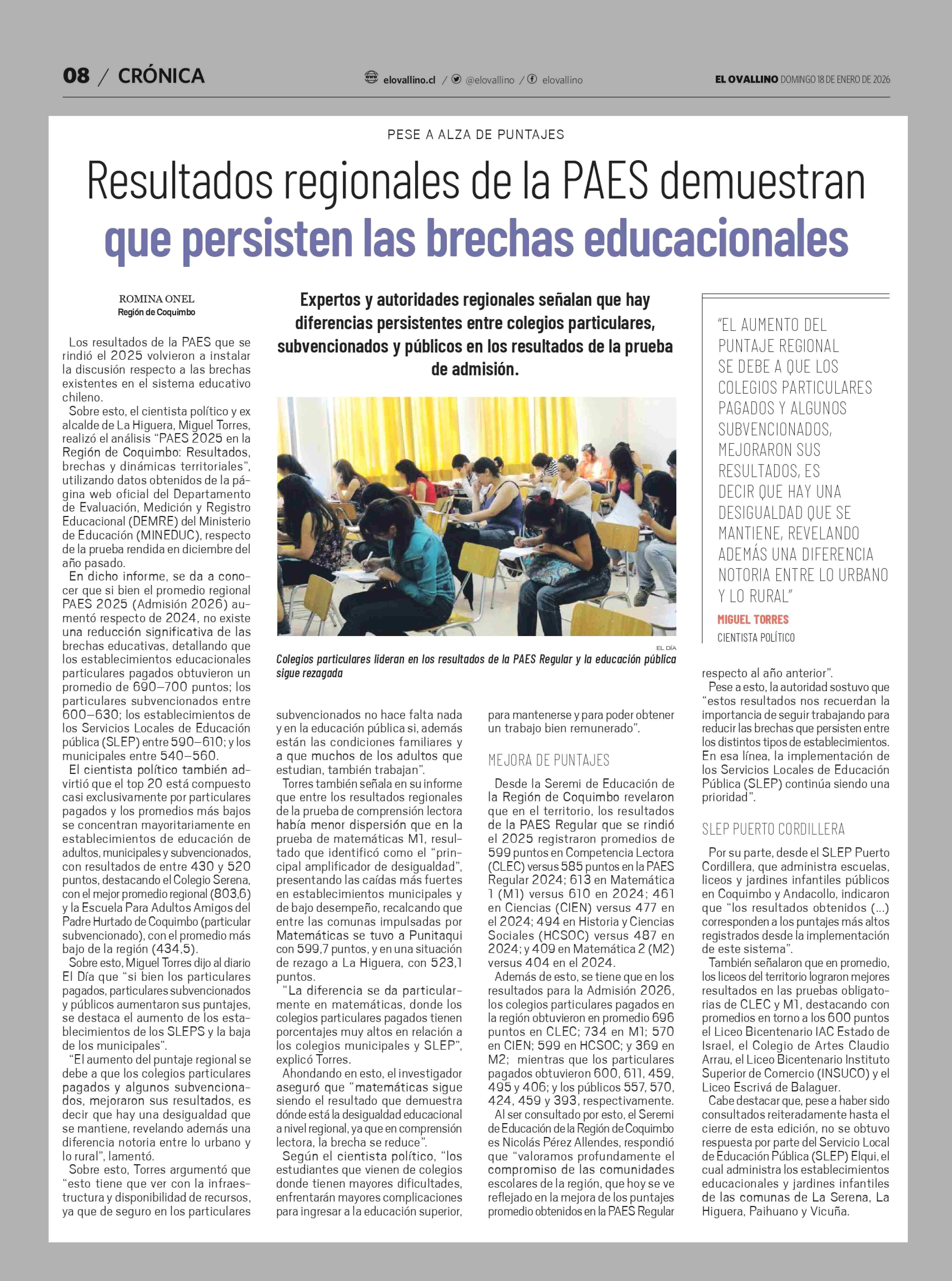 Resultados regionales de la PAES demuestran que persisten las brechas educacionales 18-01-2026 El Ovallino |