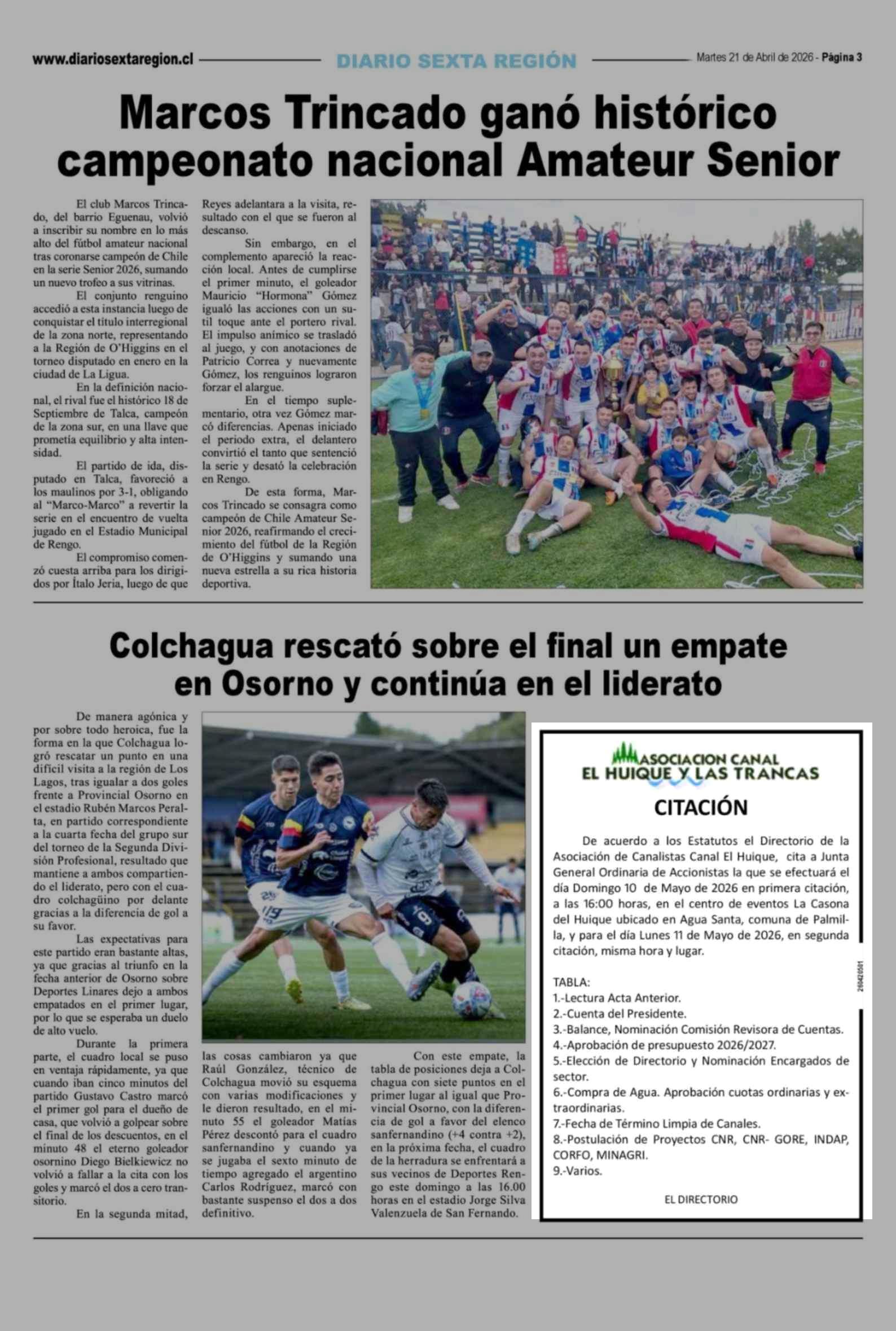 Fecha: 21-04-2026 Sector: Noticia general Región: Región del Libertador General Bernardo O'Higgins