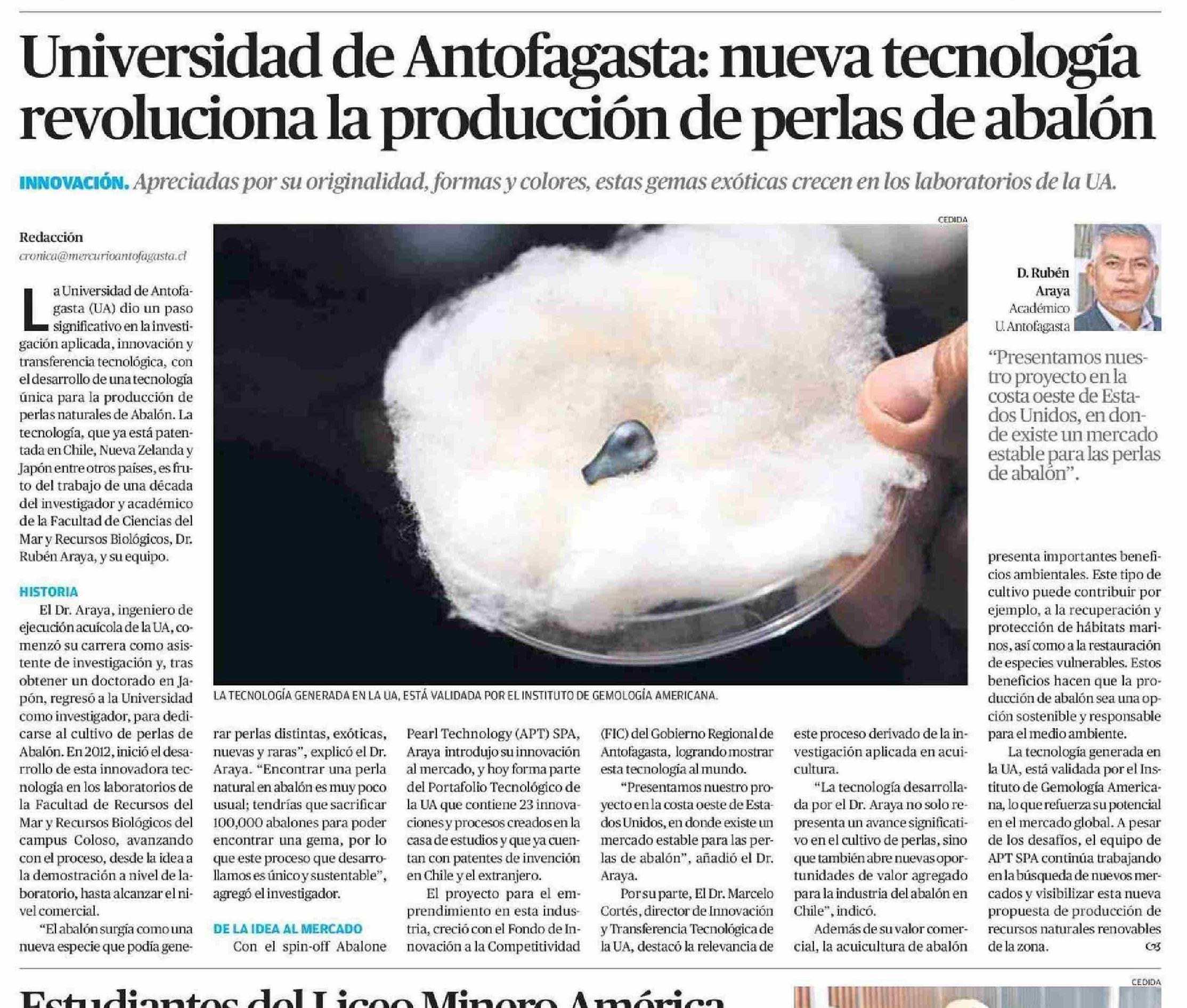 Universidad de Antofagasta: nueva tecnología revoluciona la producción de perlas de abalón 28-04-2025 El Mercurio de Calama |