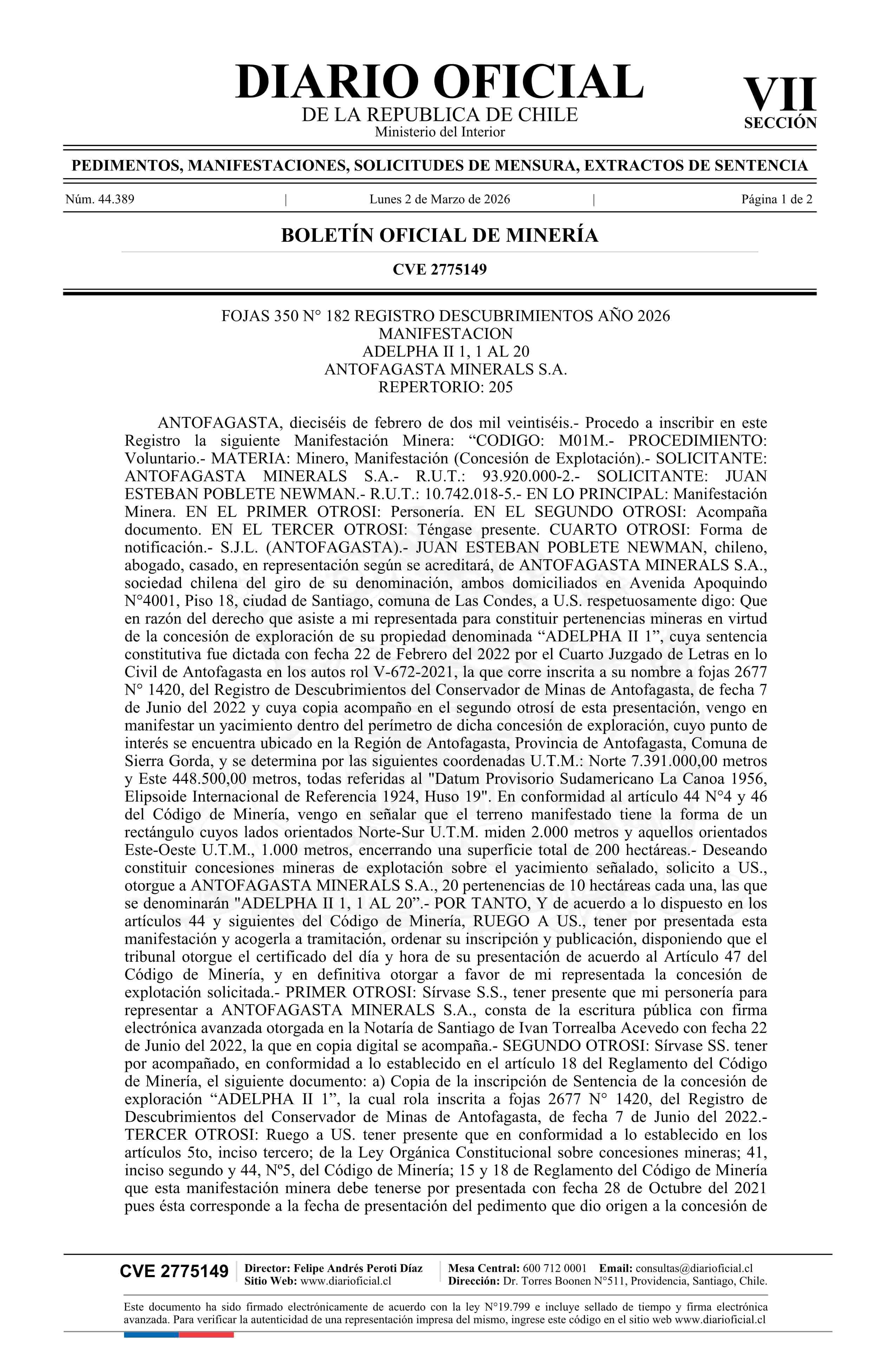 ADELPHA II 1, 1 AL 20 / Antofagasta Minerals S.A. 02-03-2026 DIARIO OFICIAL CHILE - BOLETÍN OFICIAL DE MINERÍA |