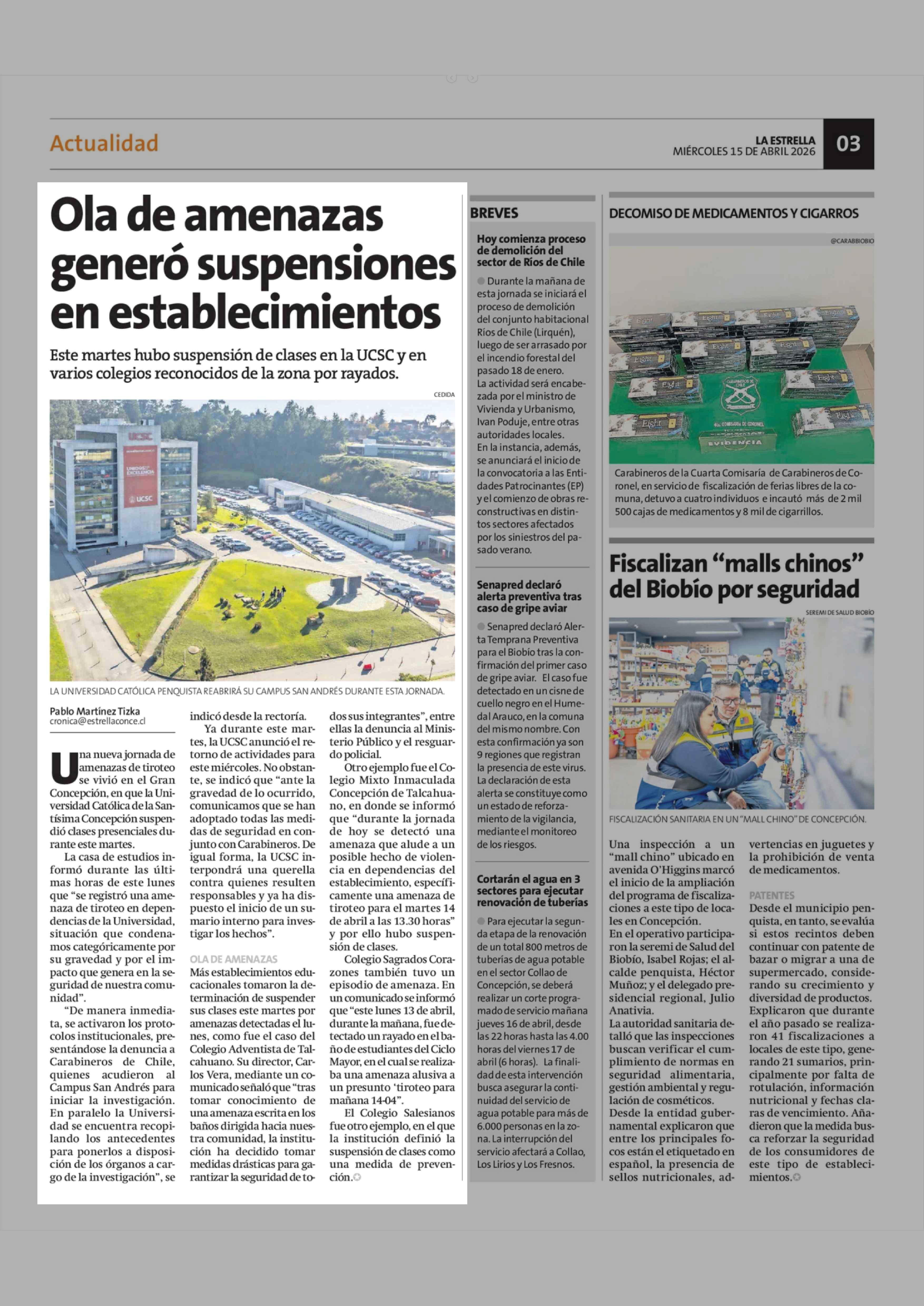 Ola de amenazas generó suspensiones en establecimientos 15-04-2026 La Estrella de Concepción |