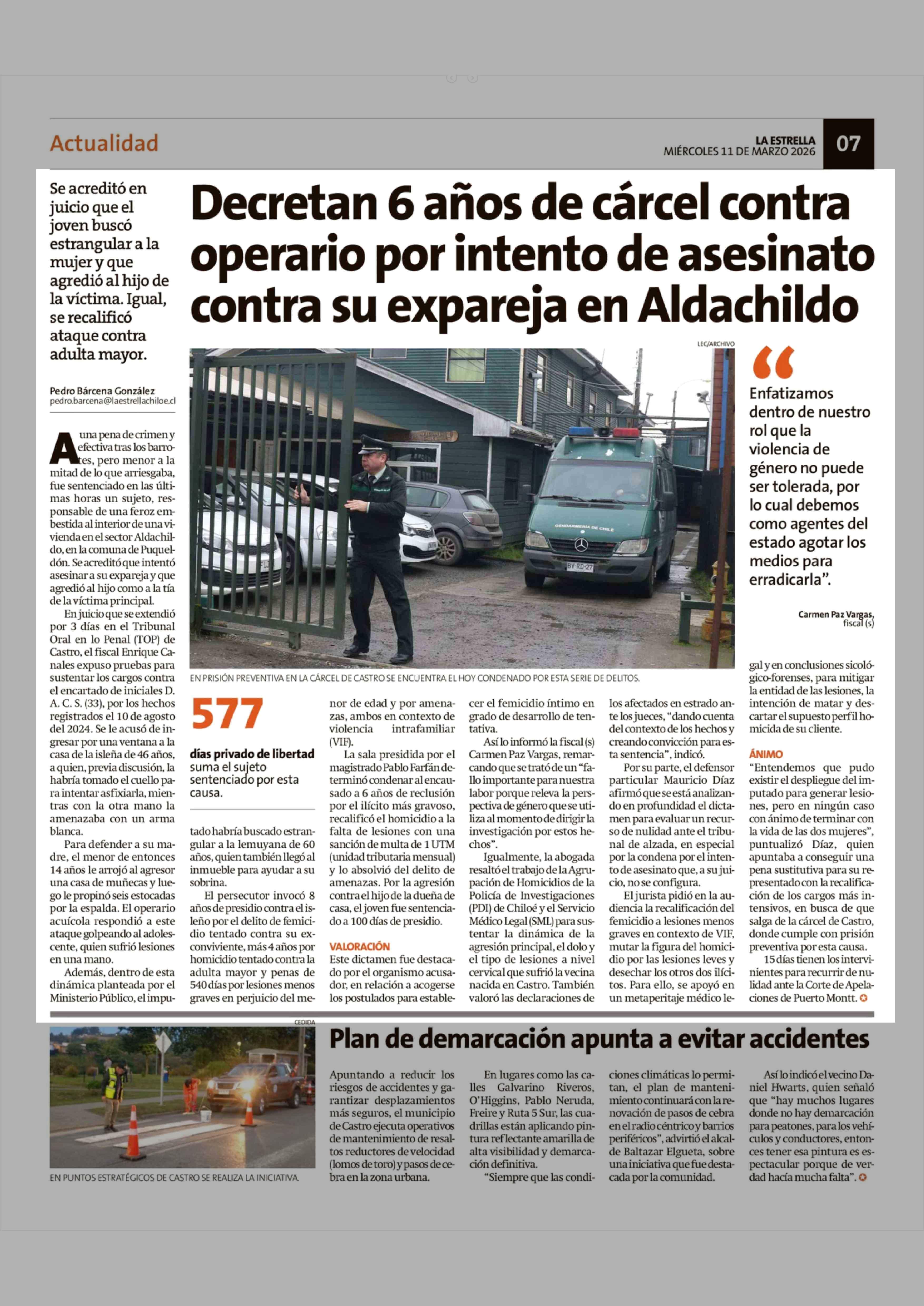 Decretan 6 años de cárcel contra operario por intento de asesinato contra su expareja en Aldachildo 11-03-2026 La Estrella de Chiloé |
