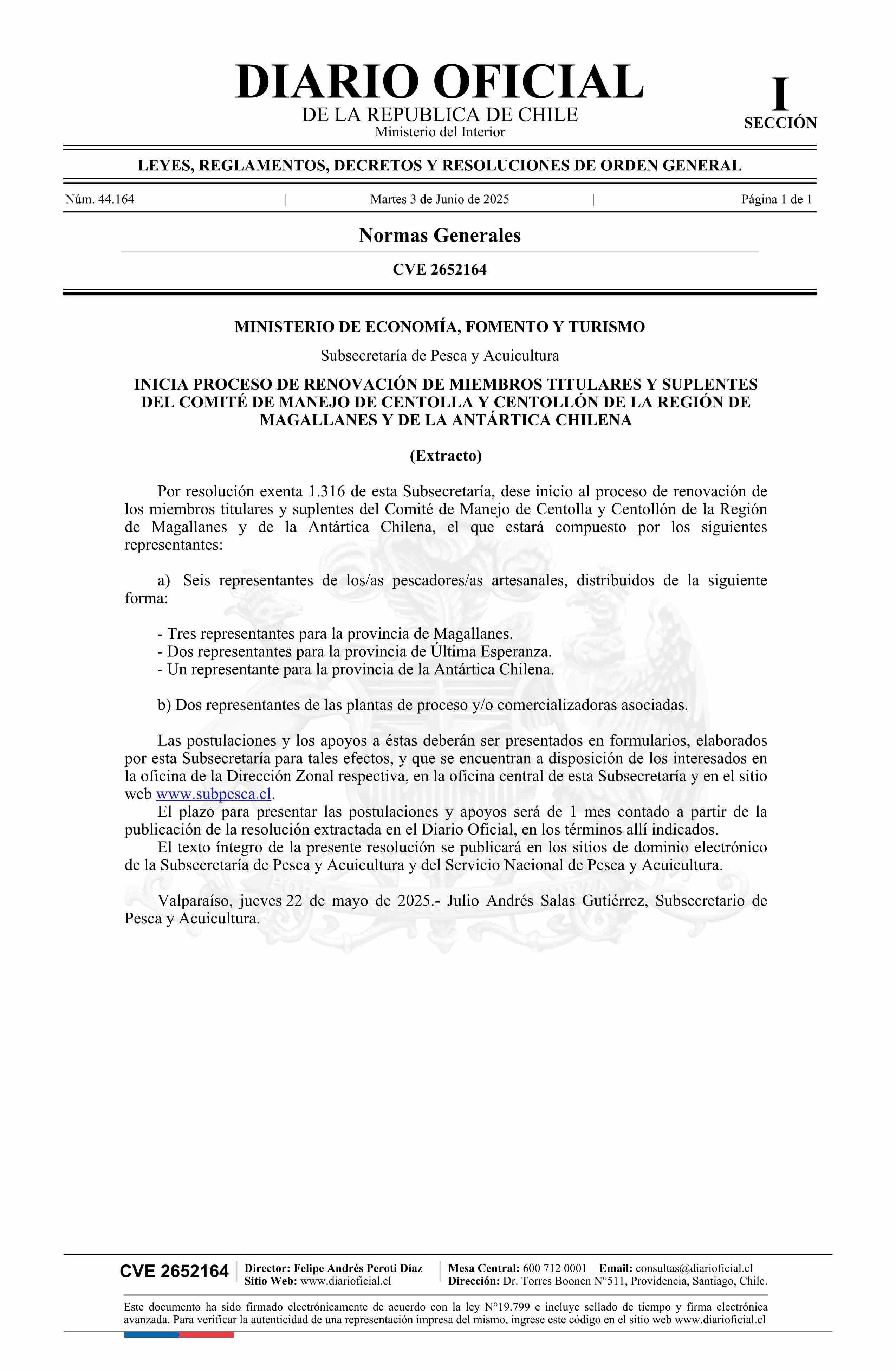Título: Extracto de resolución exenta número 1.316, de 2025.- Inicia proceso de renovación de miembros titulares y suplentes del Comité de Manejo de Centolla y Centollón de la Región de Magallanes y de la Antártica Chilena