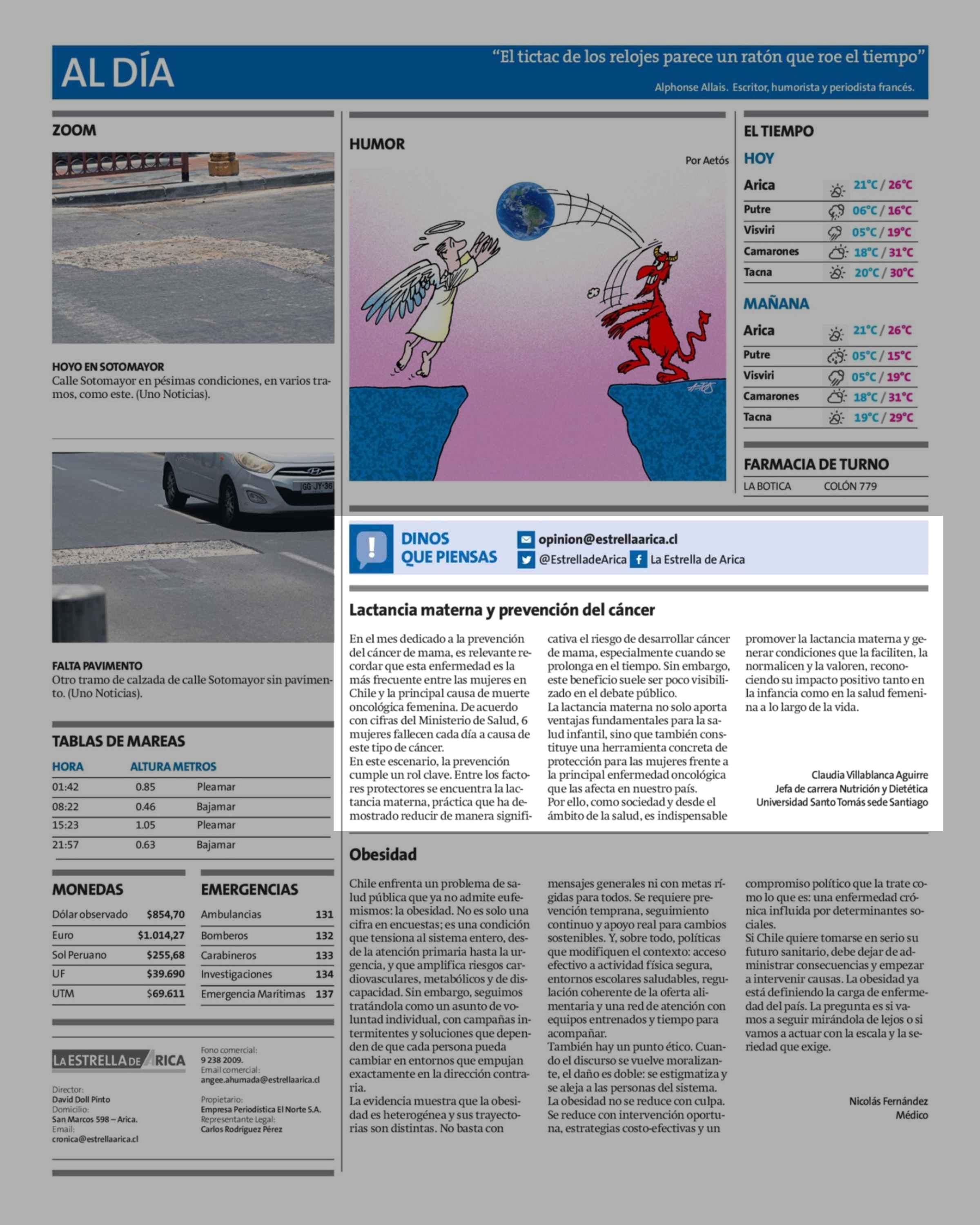 Cartas: Lactancia materna y prevención del cáncer 09-02-2026 La Estrella de Arica |
