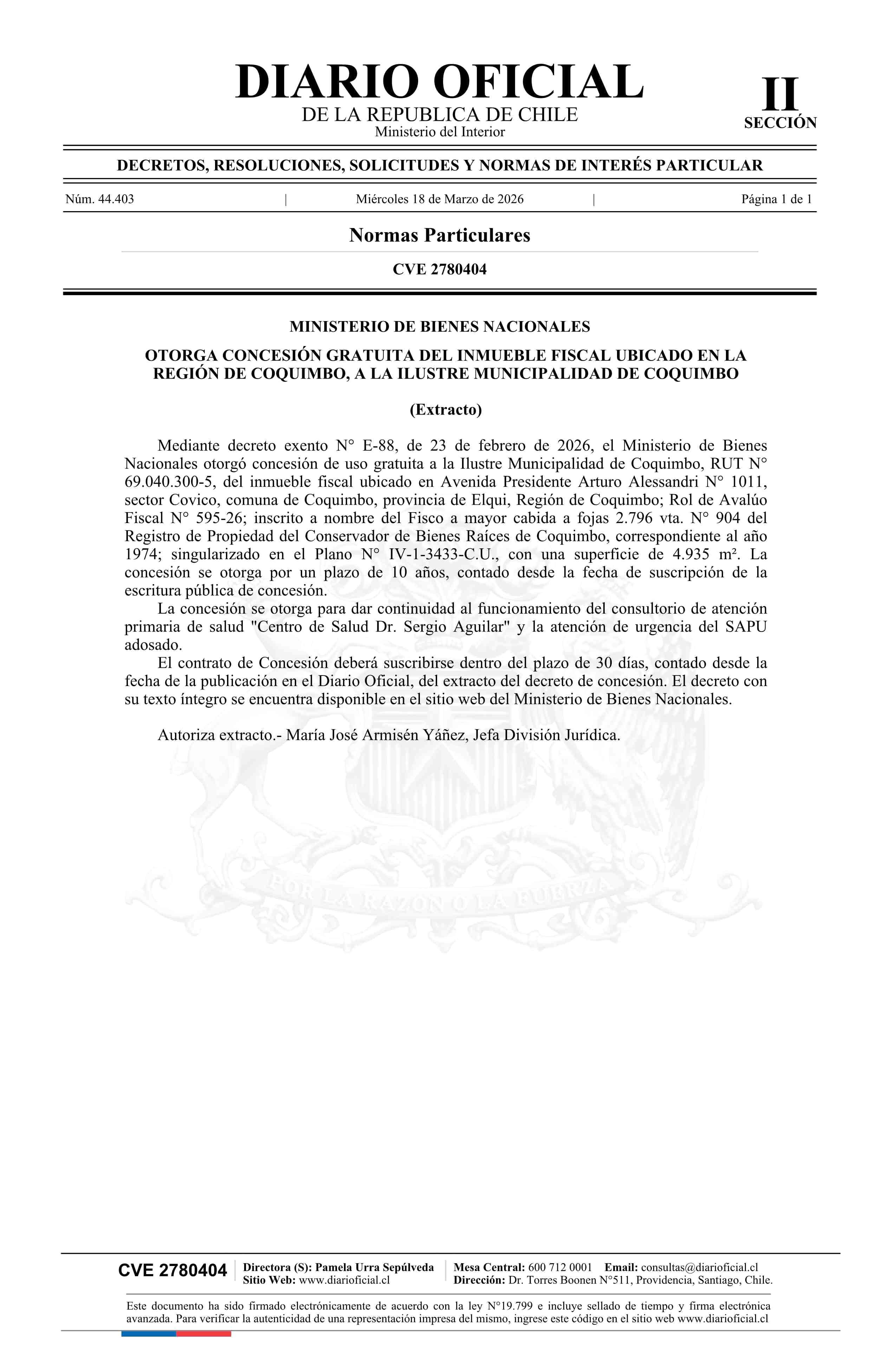 | Título: | Extracto de decreto exento número E-88, de 2026.- Otorga concesión gratuita de inmueble fiscal ubicado en la Región de Coquimbo, a la Municipalidad de Coquimbo |