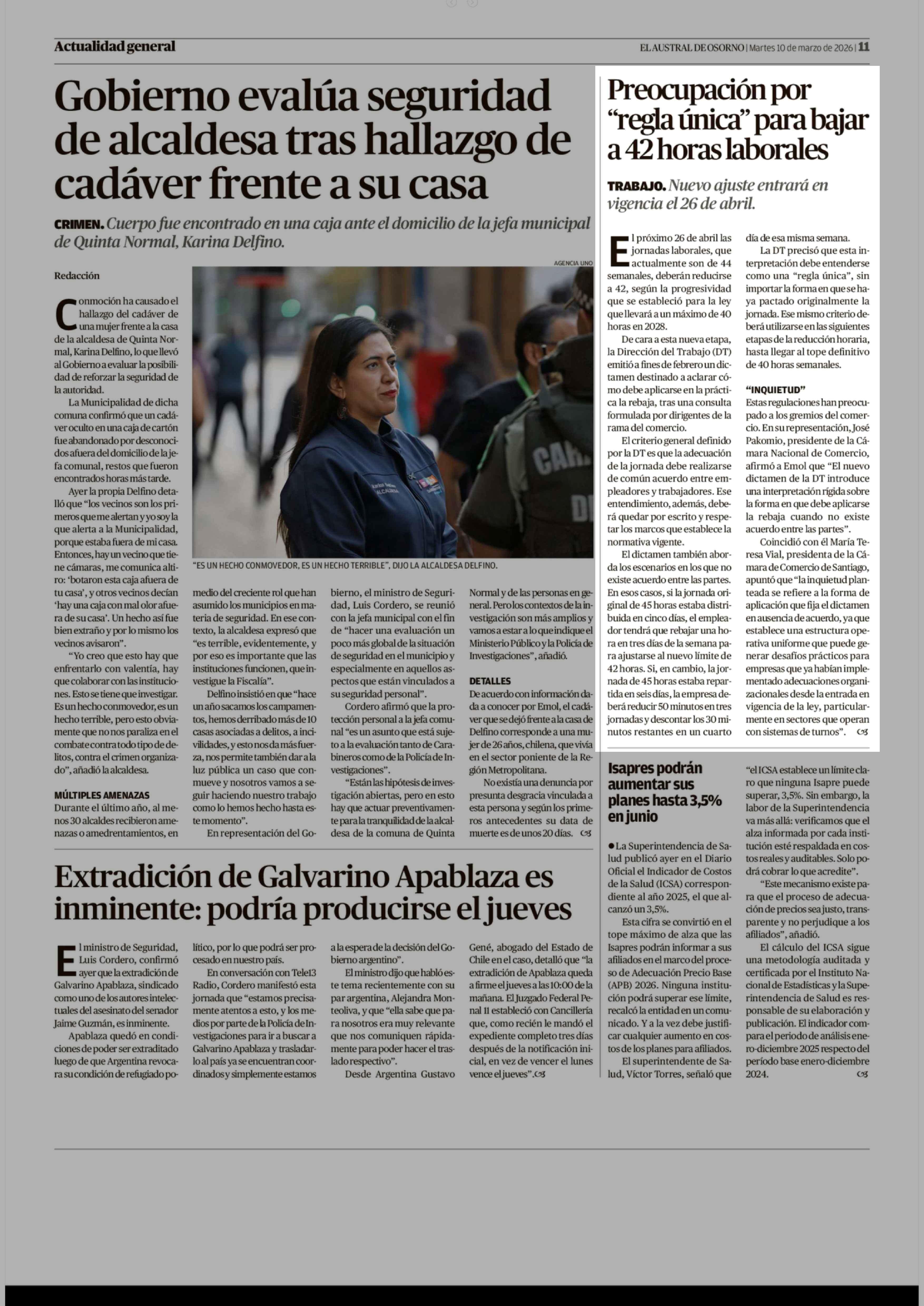 Preocupación por "regla única" para bajar a 42 horas laborales 10-03-2026 El Austral de Osorno |