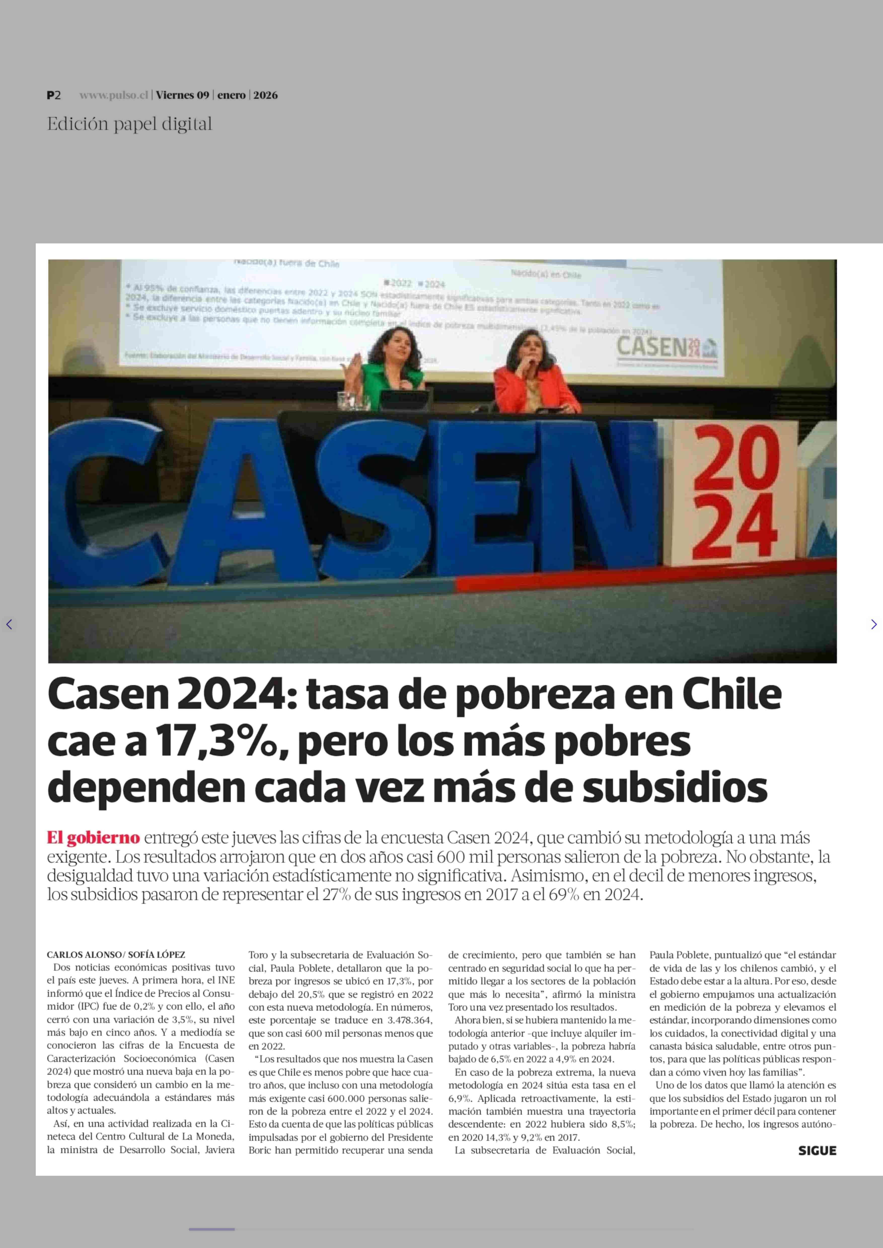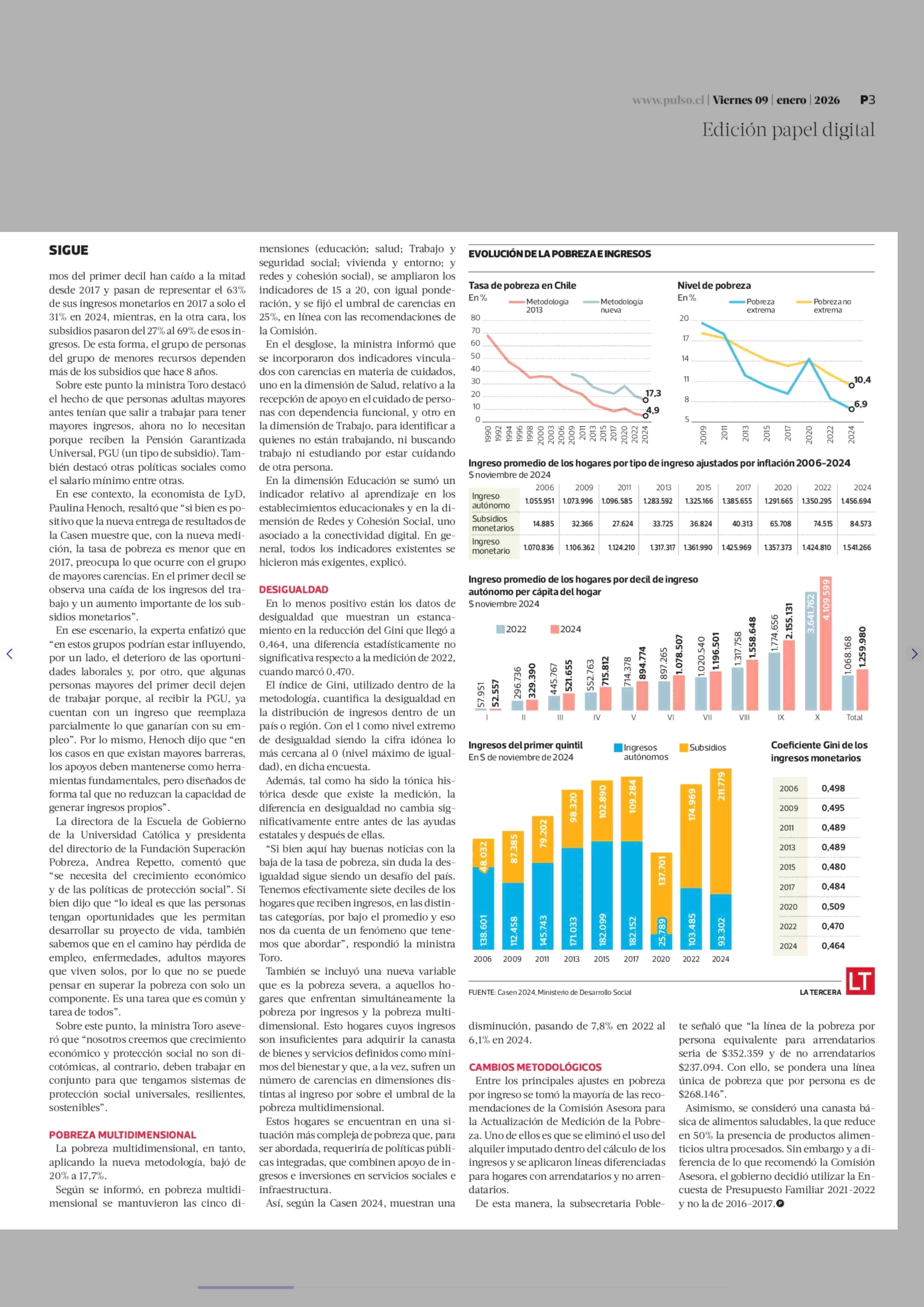 Casen 2024: tasa de pobreza en Chile cae a 17,3%, pero los más pobres dependen cada vez más de subsidios 09-01-2026 La Tercera |