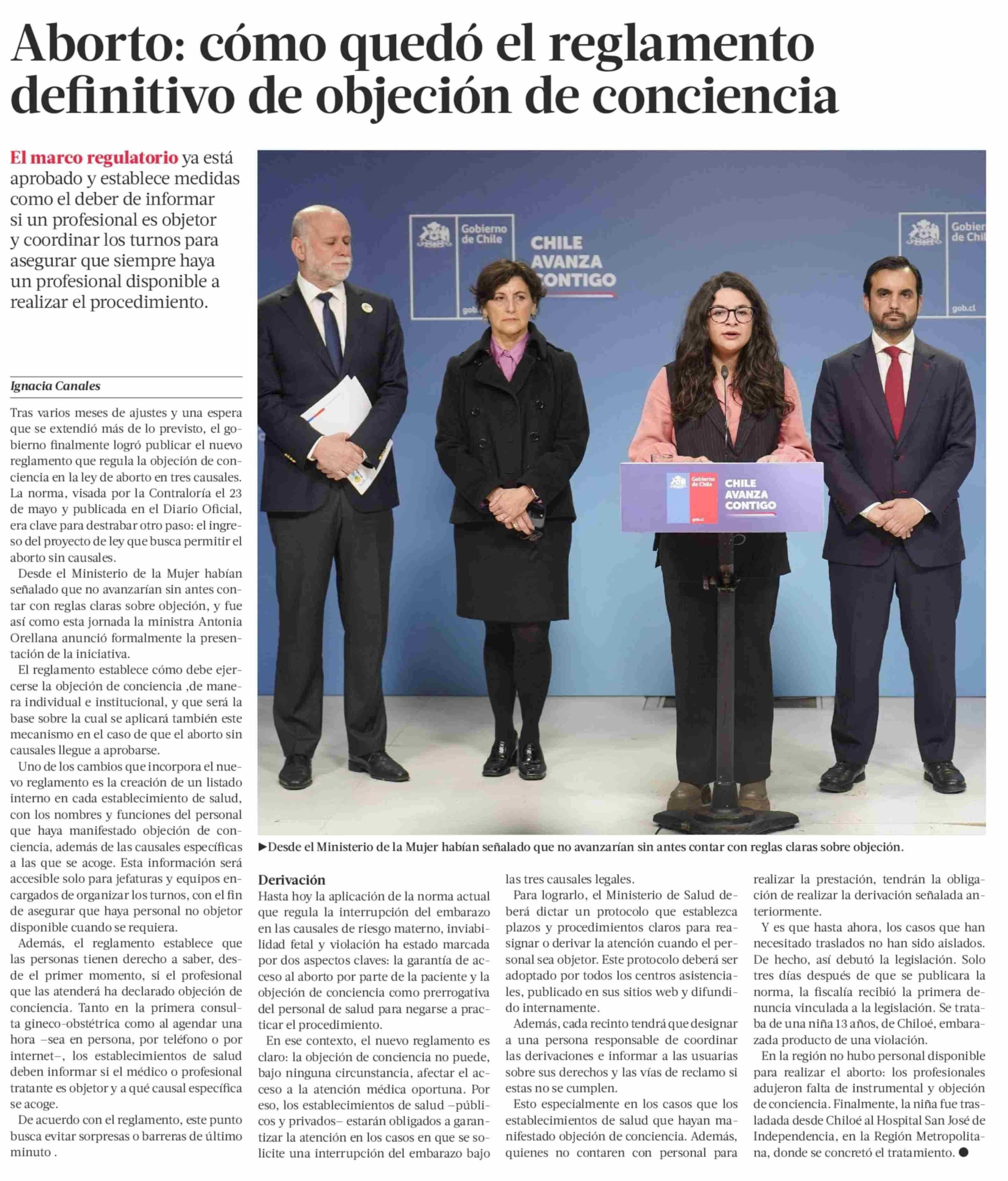 Aborto: cómo quedó el reglamento definitivo de objeción de conciencia 29-05-2025 La Tercera |