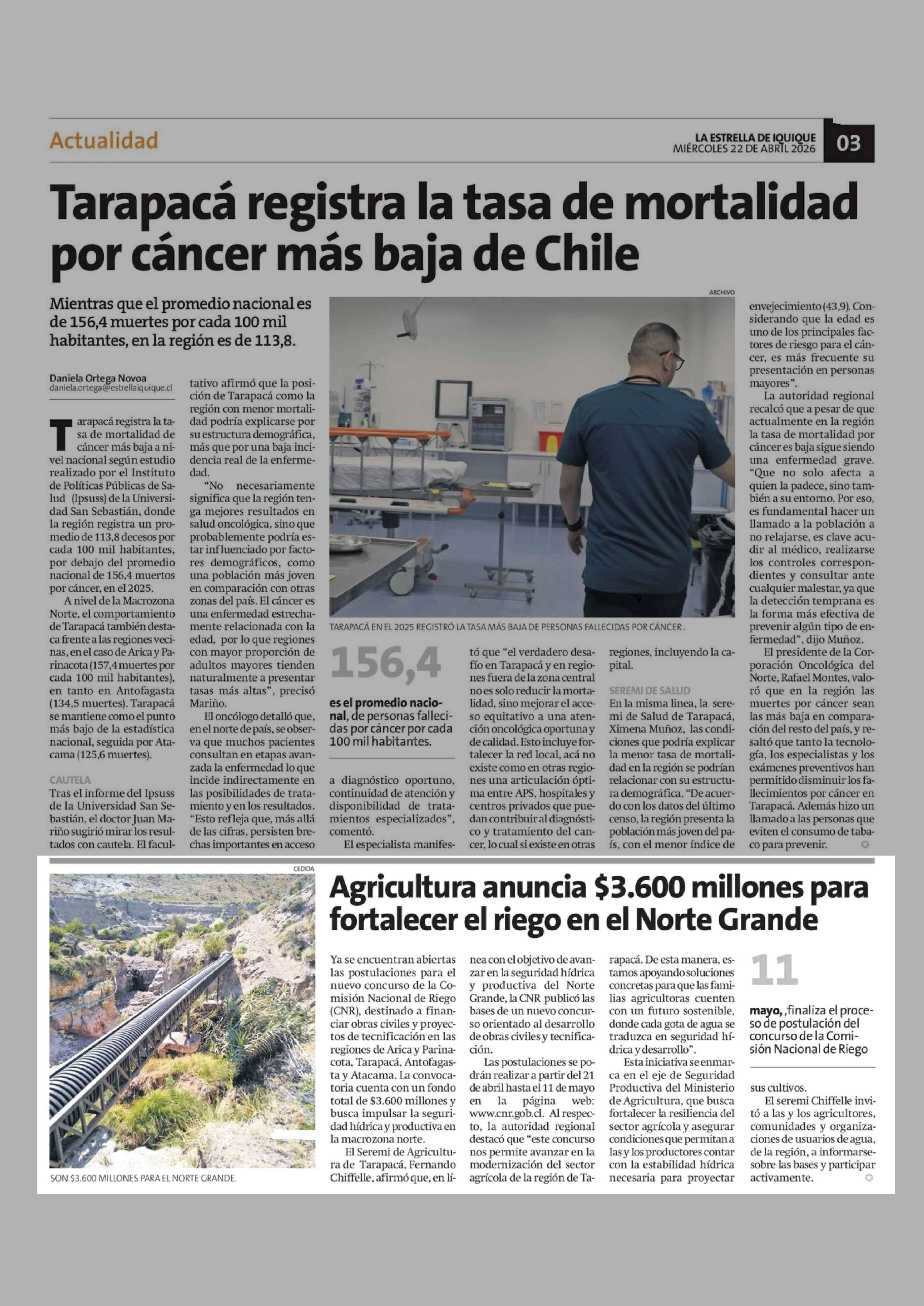 Agricultura anuncia $3.600 millones para fortalecer el riego en el Norte Grande 22-04-2026 La Estrella de Iquique |