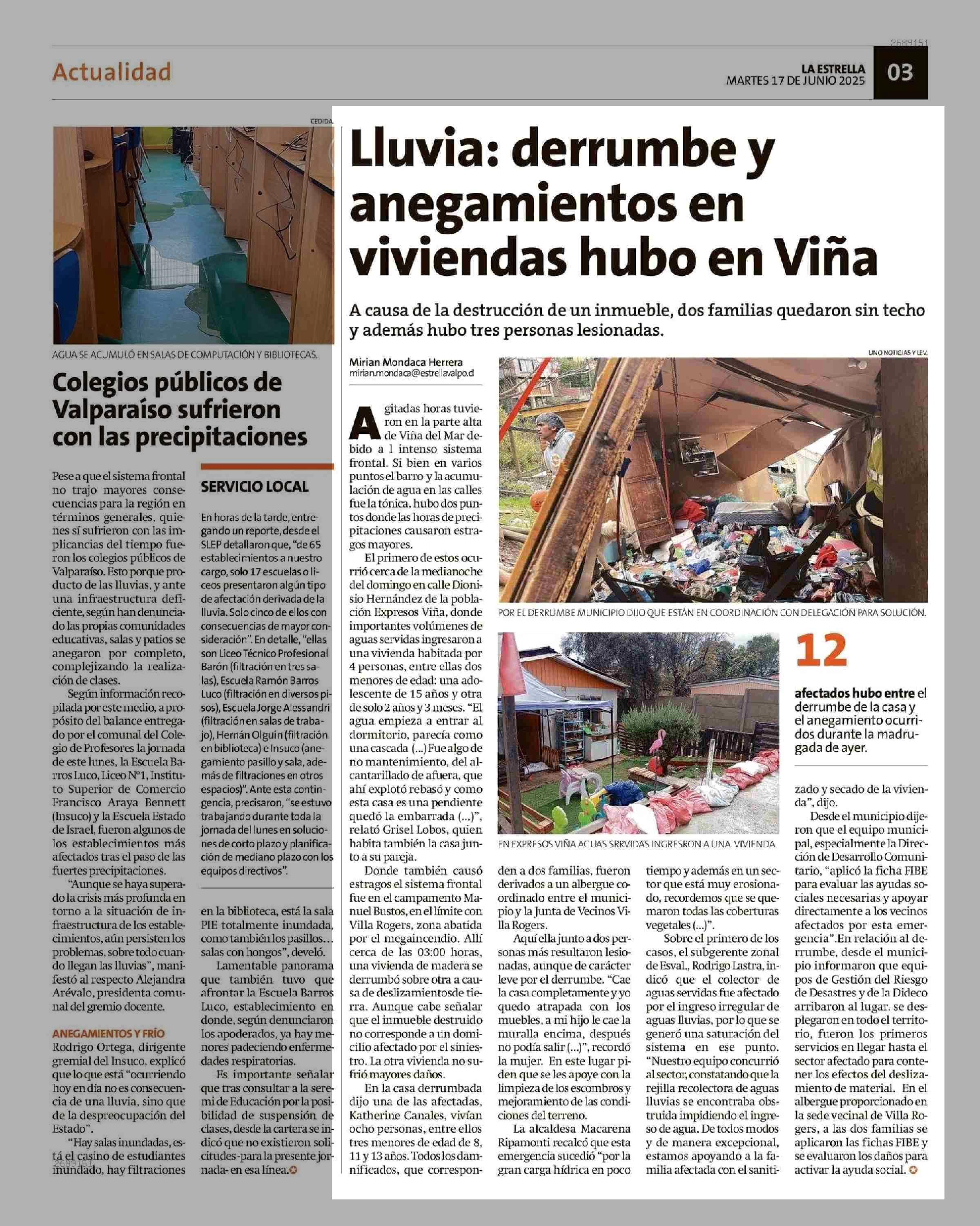 Lluvia: derrumbe y anegamientos en viviendas hubo en Viña 17-06-2025 La Estrella de Valparaíso |
