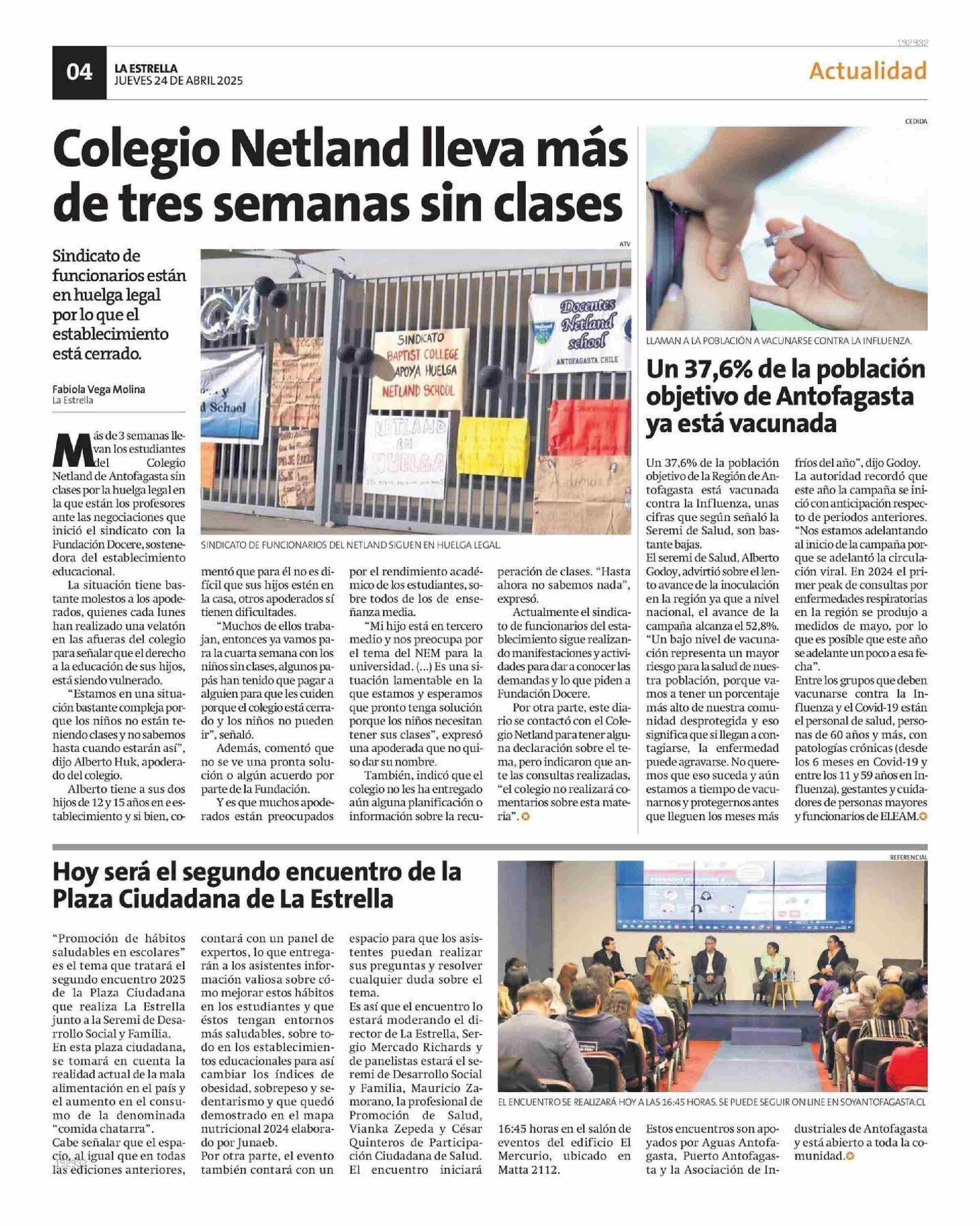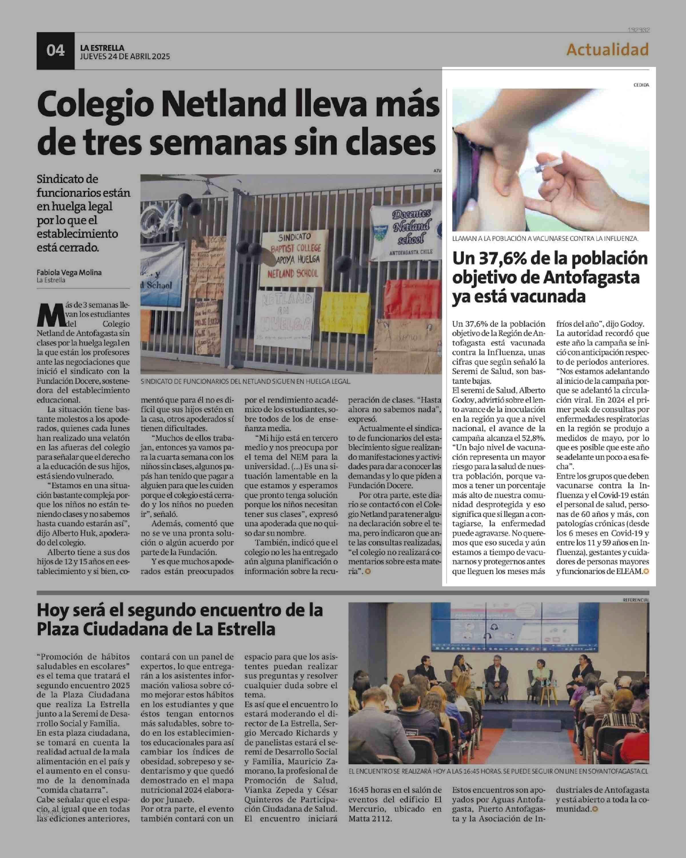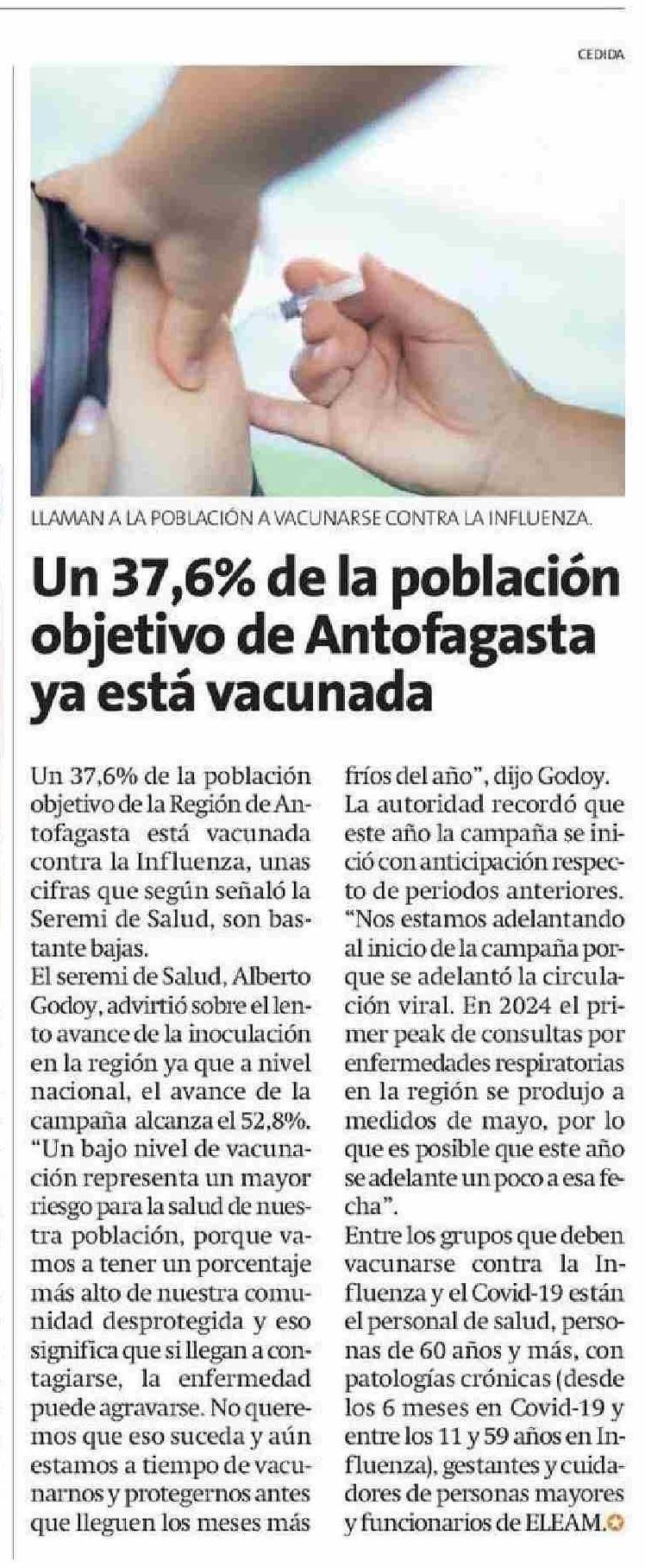 Un 37,6% de la población objetivo de Antofagasta ya está vacunada 24-04-2025 La Estrella de Antofagasta |