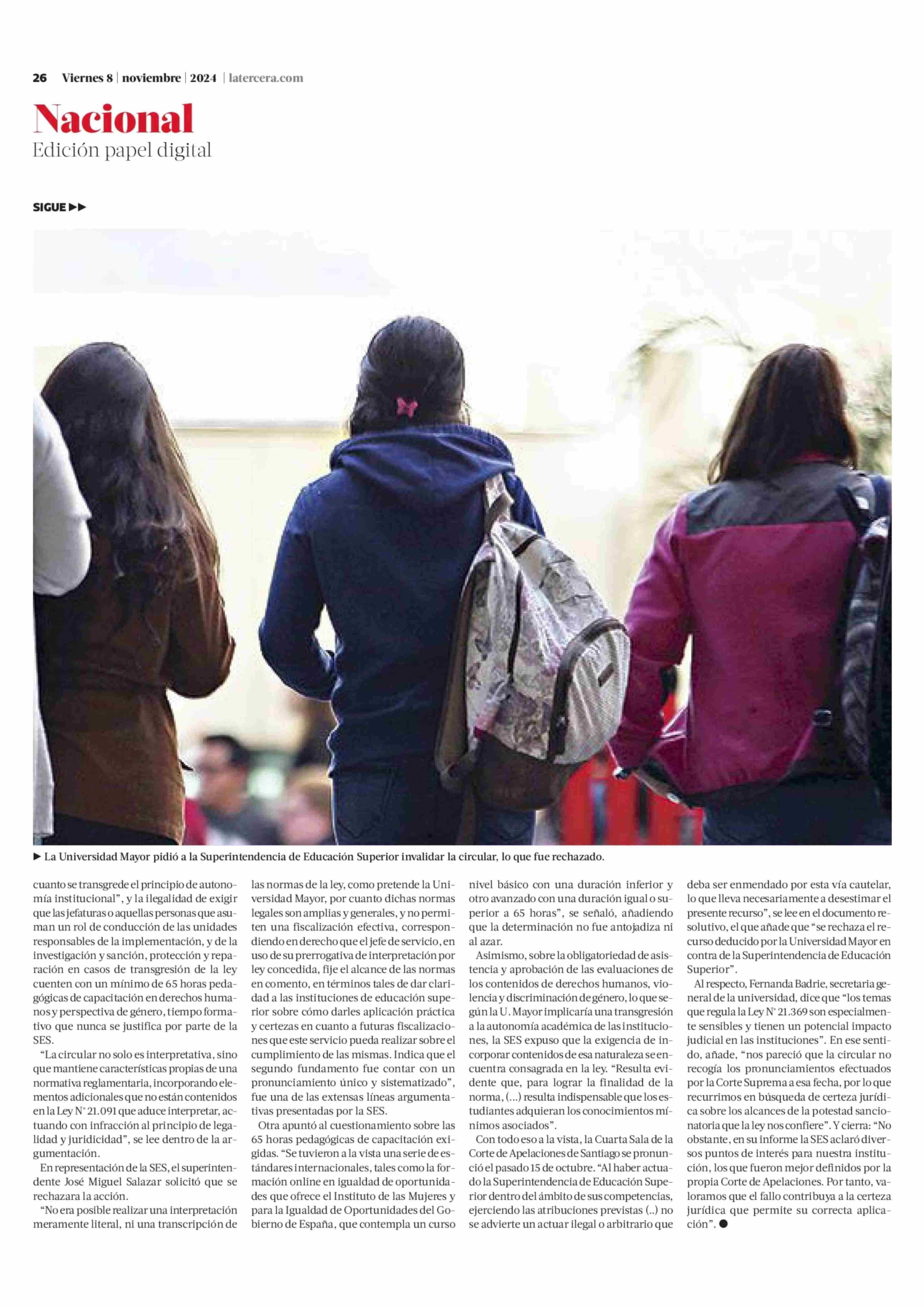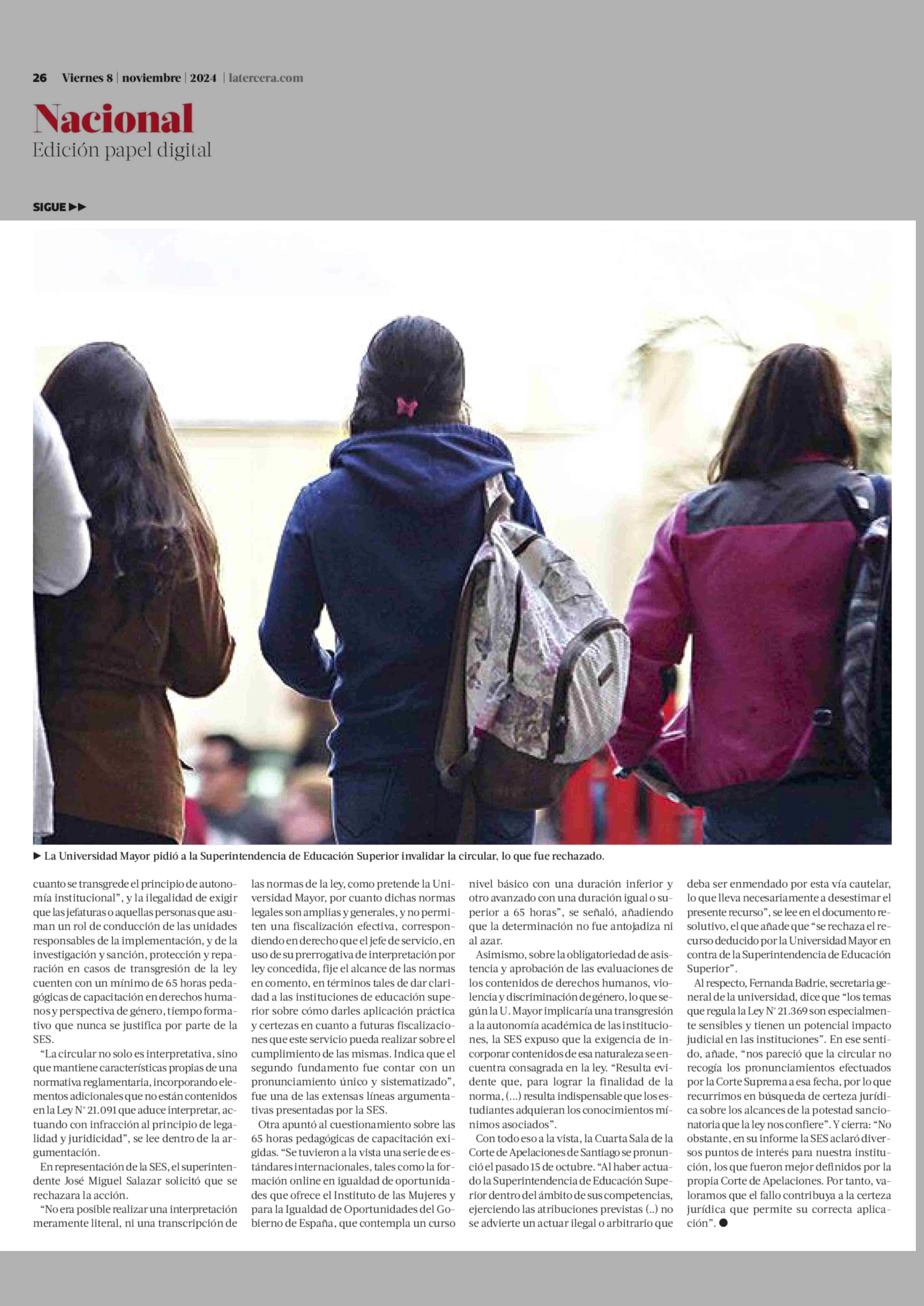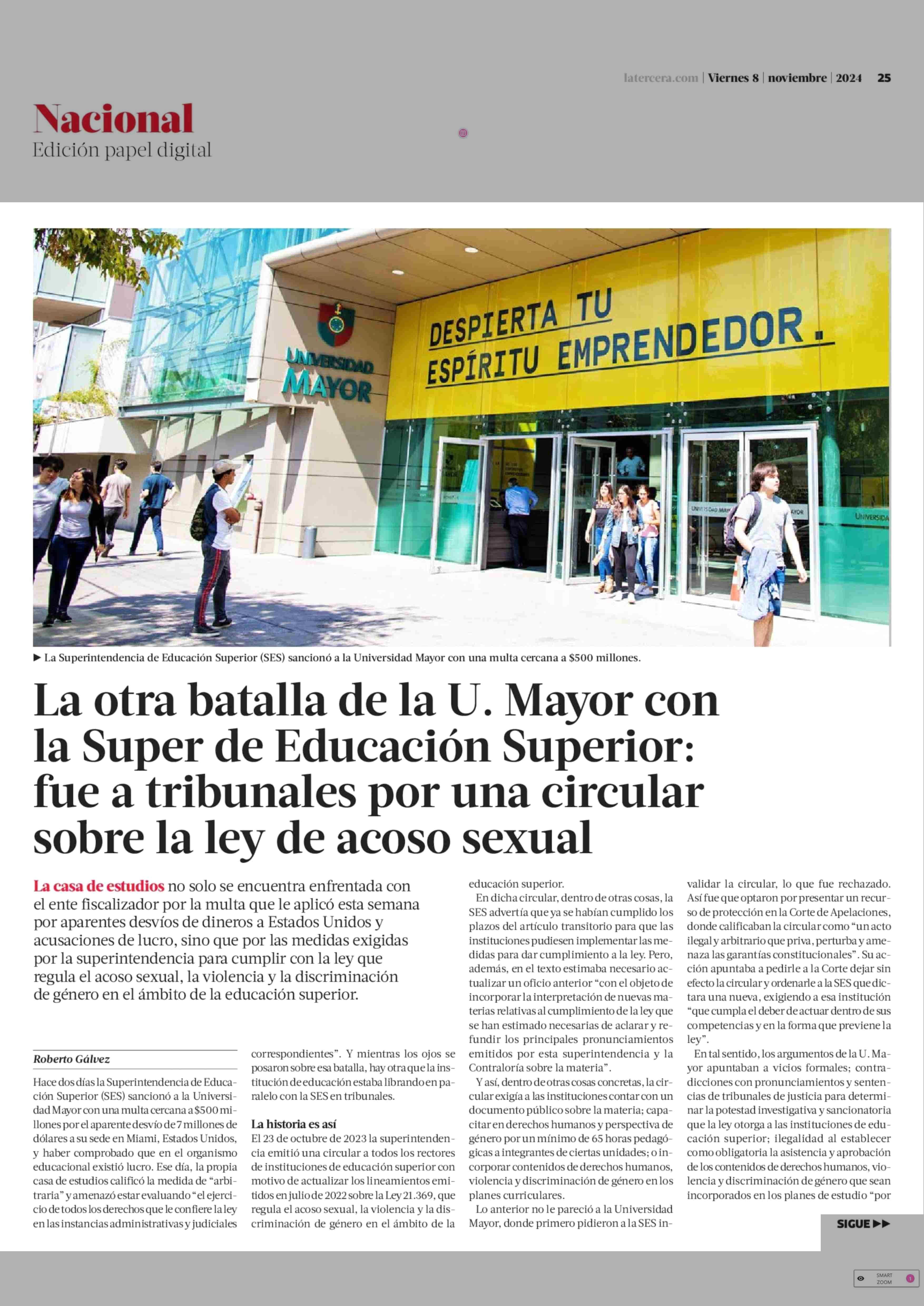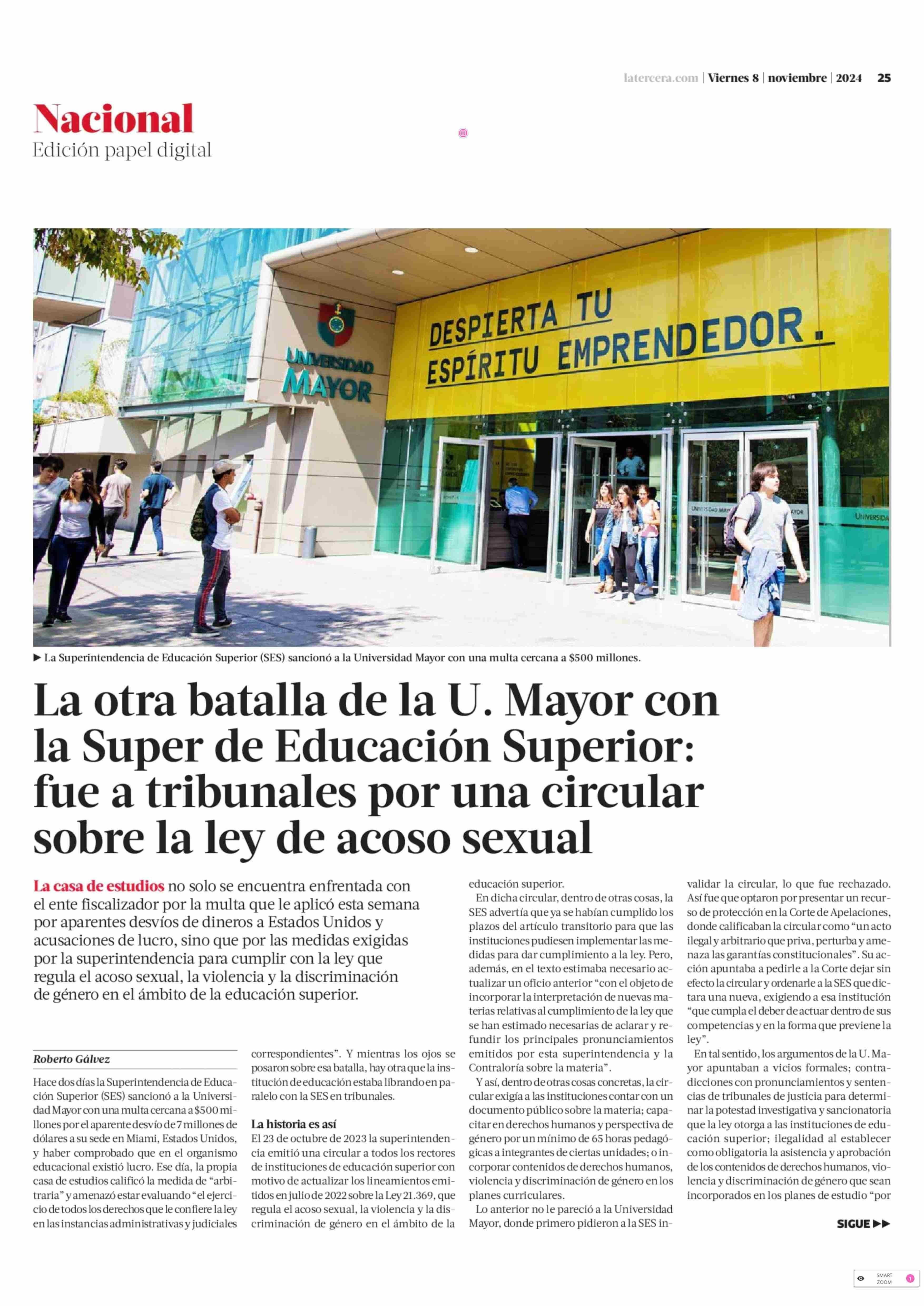 La otra batalla de la U. Mayor con la Super de Educación Superior: fue a tribunales por una circular sobre la ley de acoso sexual 08-11-2024 La Tercera |